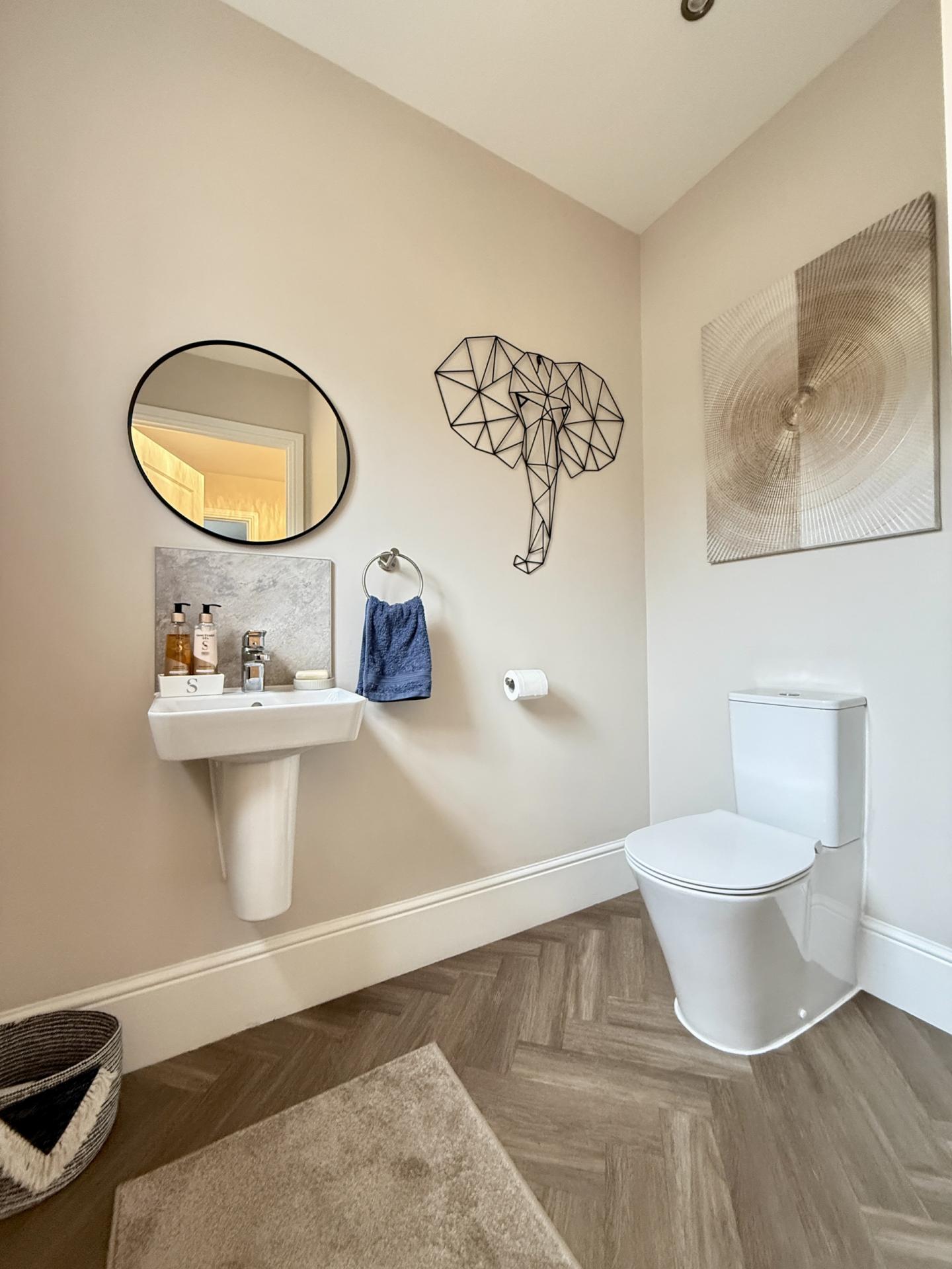 CLOAKROOM: Close coupled WC, wash hand basin, radiator, double glazed window to the front.