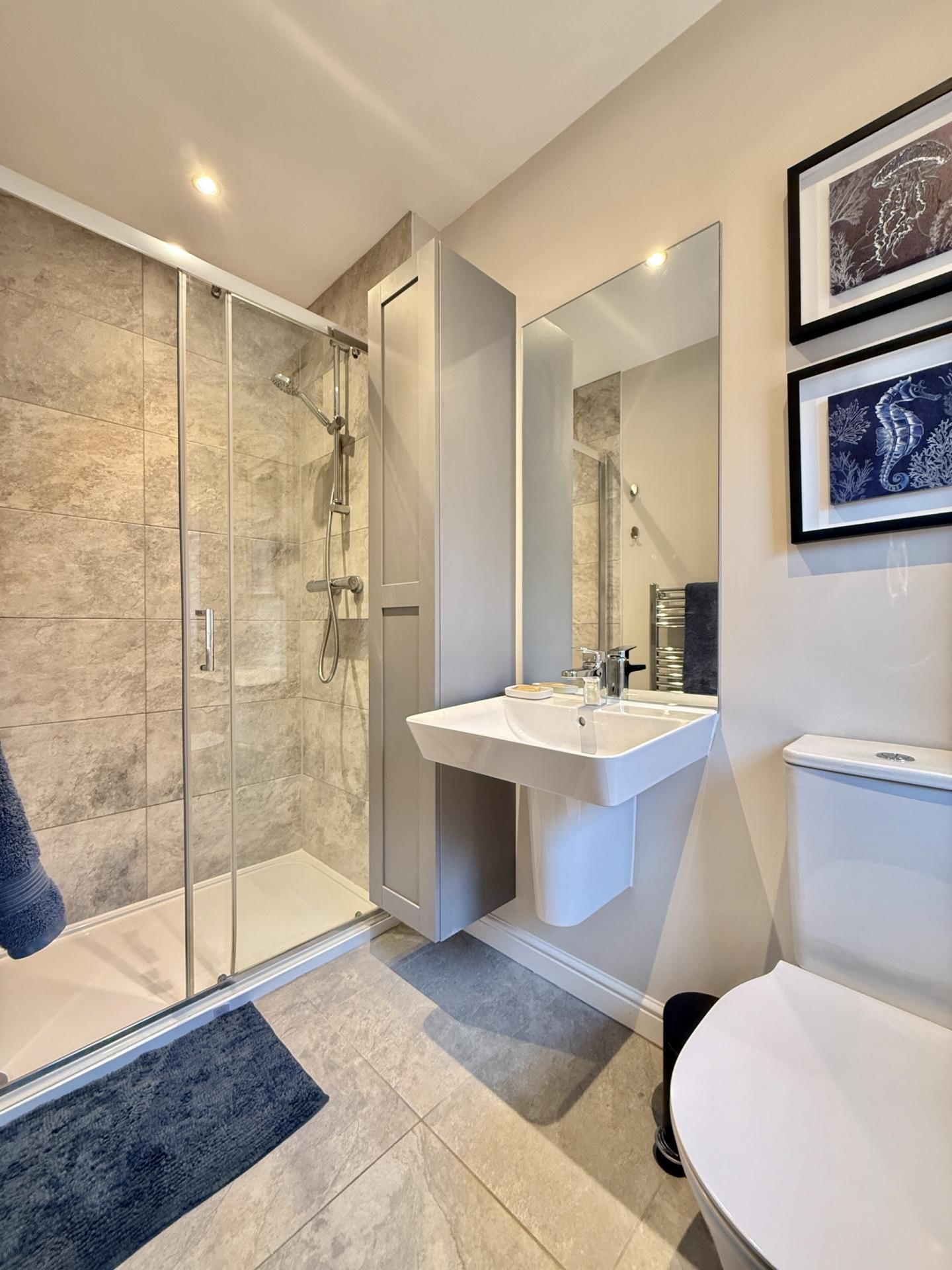 EN-SUITE: Close coupled WC, wash hand basin, shower cubicle, radiator, double glazed window to the side.