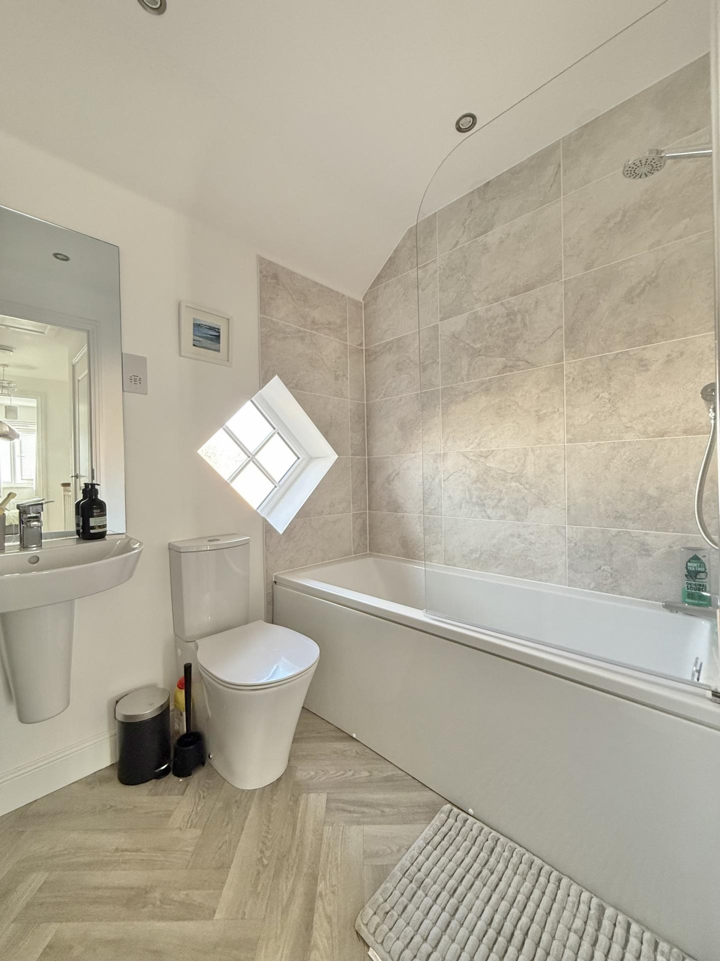 BATHROOM: Close coupled WC, wash hand basin, panelled bath with shower over, heated towel rail, double glazed window to the front.