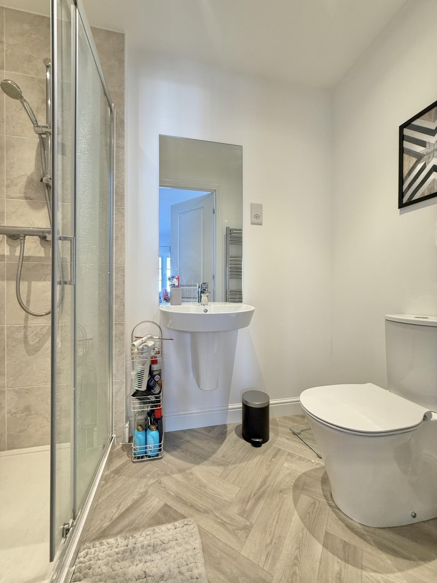 EN-SUITE: Close coupled WC, pedestal wash hand basin, shower cubicle with wall mounted shower.