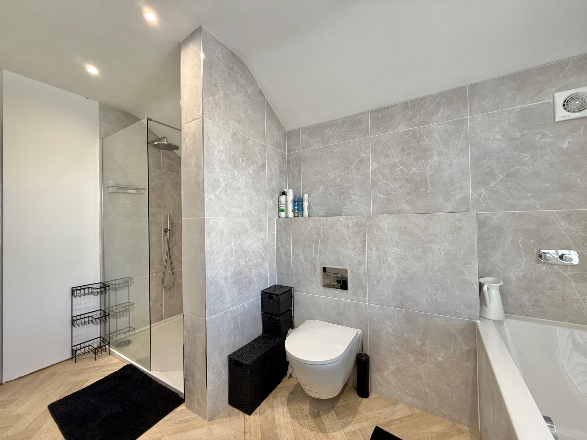 BATHROOM: Walk in shower cubicle, wash hand basin, WC with concealed cistern, jacuzzi bath, towel rail, double glazed window to the rear.