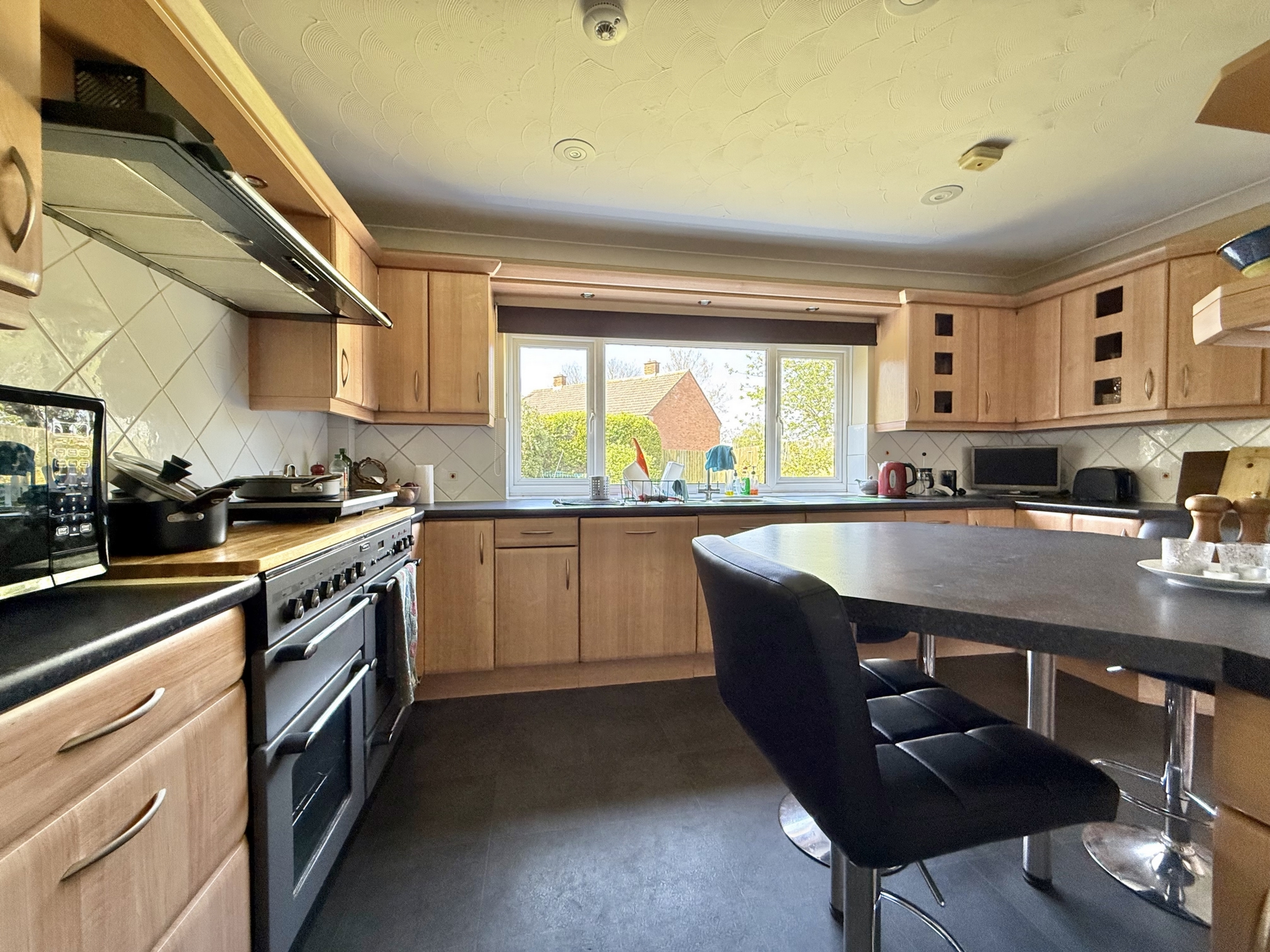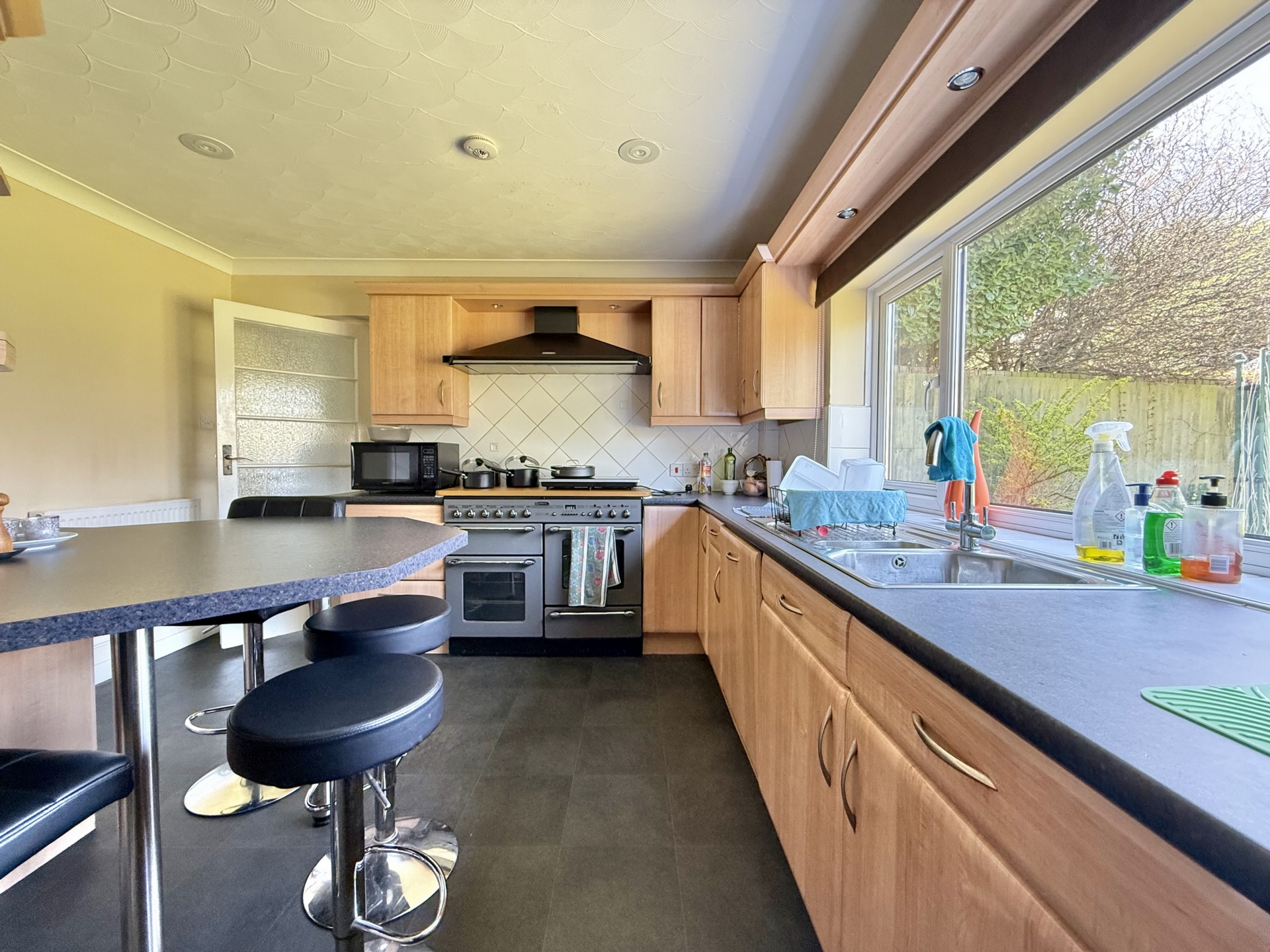 KITCHEN/BREAKFAST ROOM: 4.4m x 3.6m (14'5" x 11'10") Maximum, Base cupboards and drawers with worktop over, sink and drainer, breakfast bar, wall mounted cupboards, range double fan oven with gas hob and hood over, built in dishwasher, space for fridge freezer, radiator, double glazed window to the rear, door to..