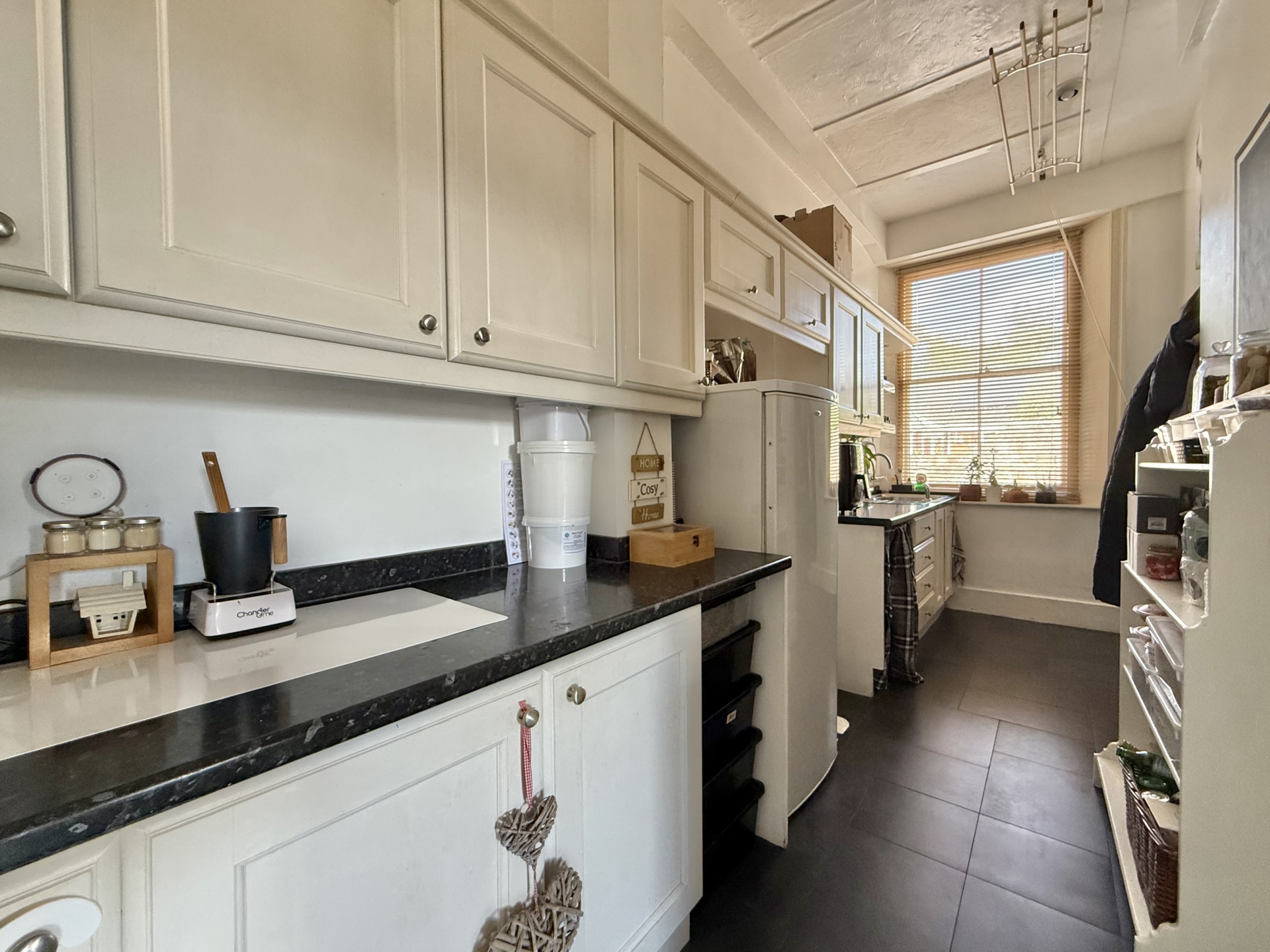 UTILITY ROOM: 5.3m x 4.3m (17'5" x 14'1") Maximum, Radiators, base cupboards and drawers with worktop over, wall mounted cupboards, sink and drainer, cupboard housing hot water tank, larder cupboard. space for washing machine, window to the side, door to the side.