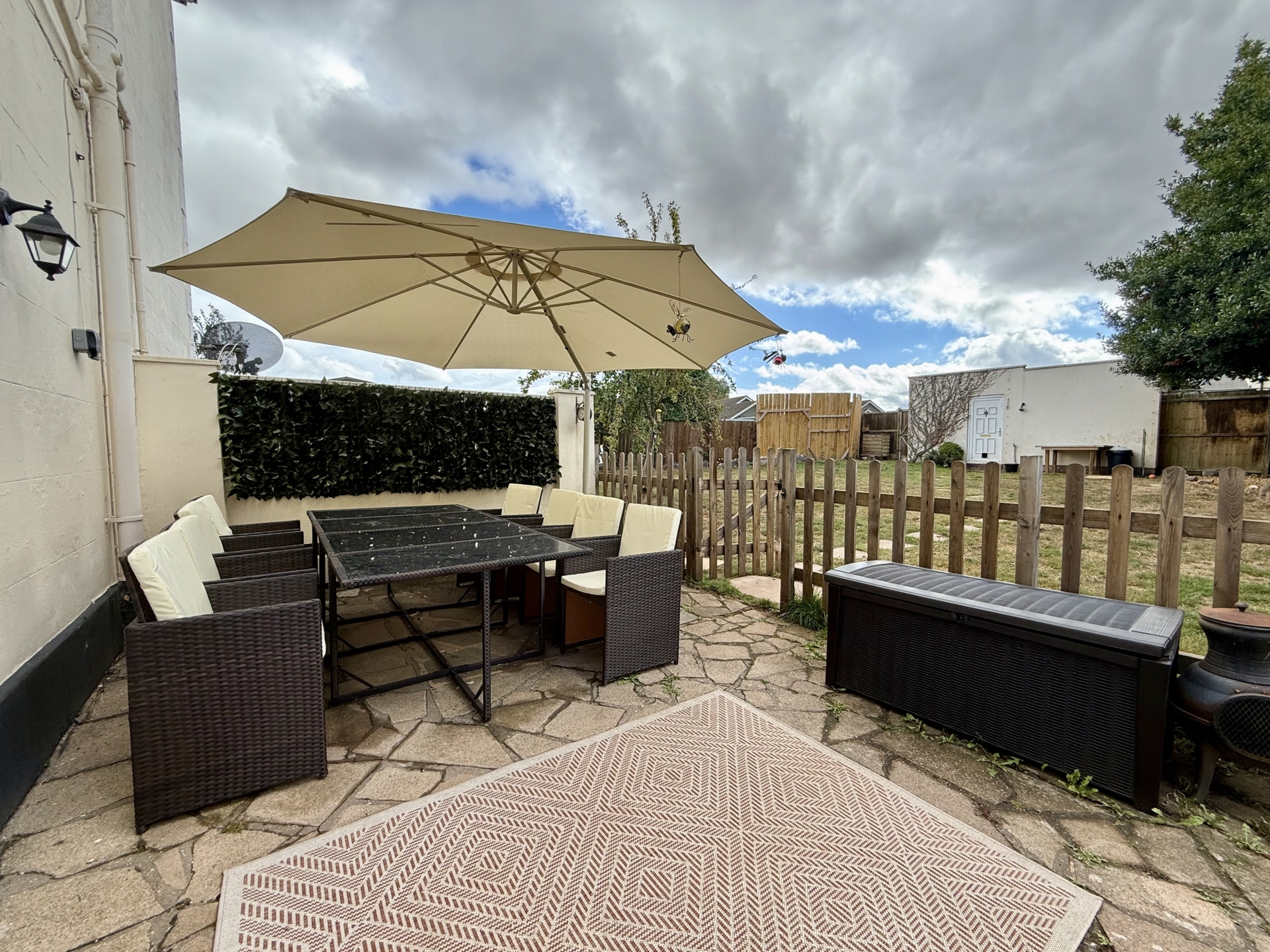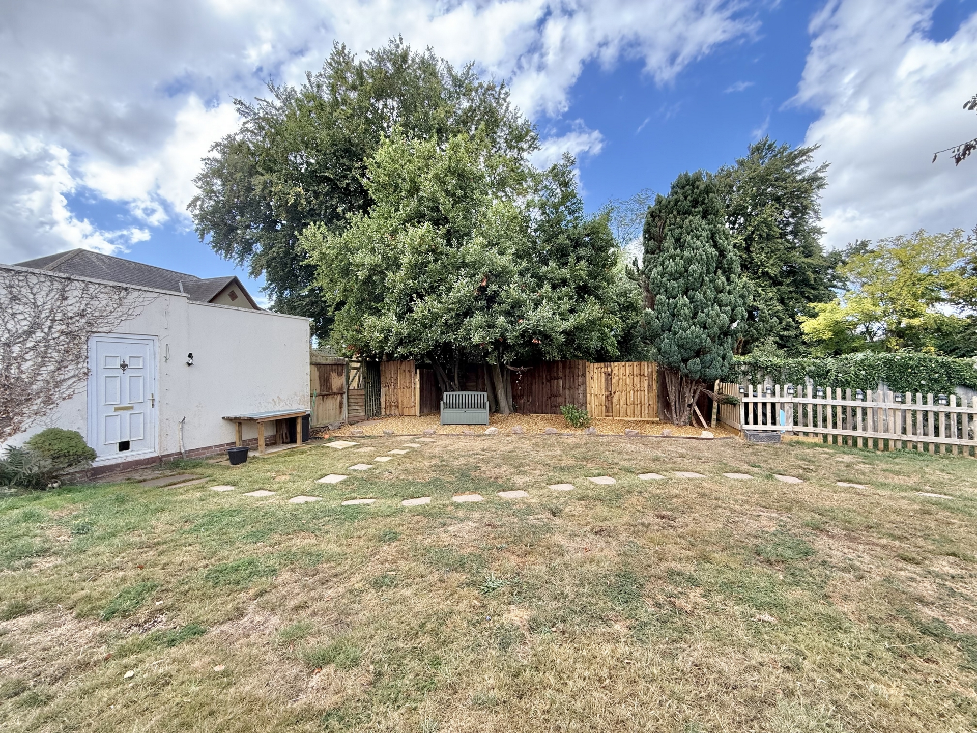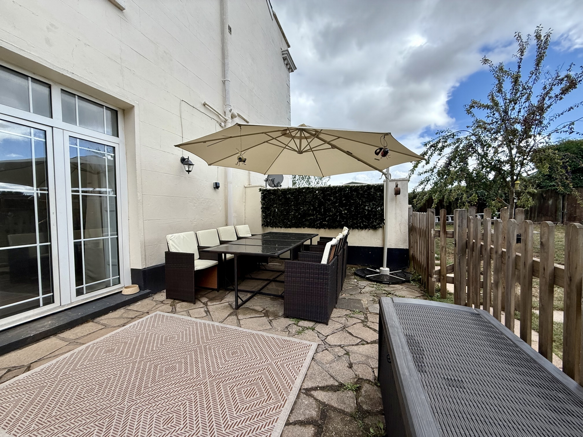 OUTSIDE: The front of the property features gated access onto a spacious driveway offering ample parking for multiple vehicles, with access to a detached double garage located to the side. The front garden is predominantly laid to lawn, bordered by mature hedging, and includes a useful storage shed. To the left of the house, a generous enclosed garden offers a paved terrace perfect for al fresco dining surrounded by well-maintained borders with hedgerow, shrubs, and mature trees, providing privacy and a tranquil setting.