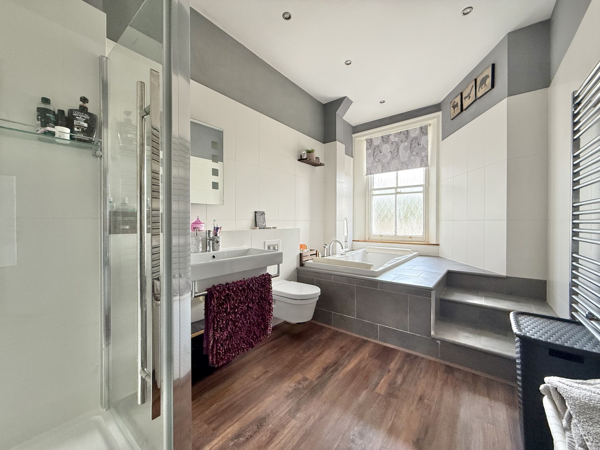 FAMILY BATHROOM: Sunken bath, WC with concealed cistern, wash hand basin, radiators, window to the side, separate shower cubicle.