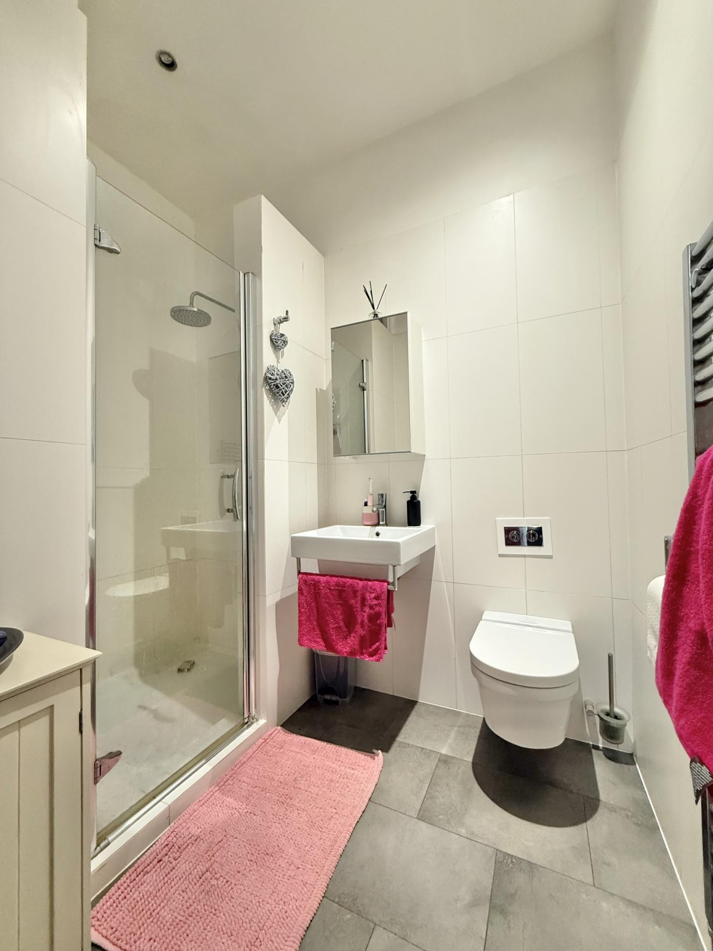 SHOWER ROOM: WC with concealed cistern, wash hand basin, towel rail, shower cubicle.