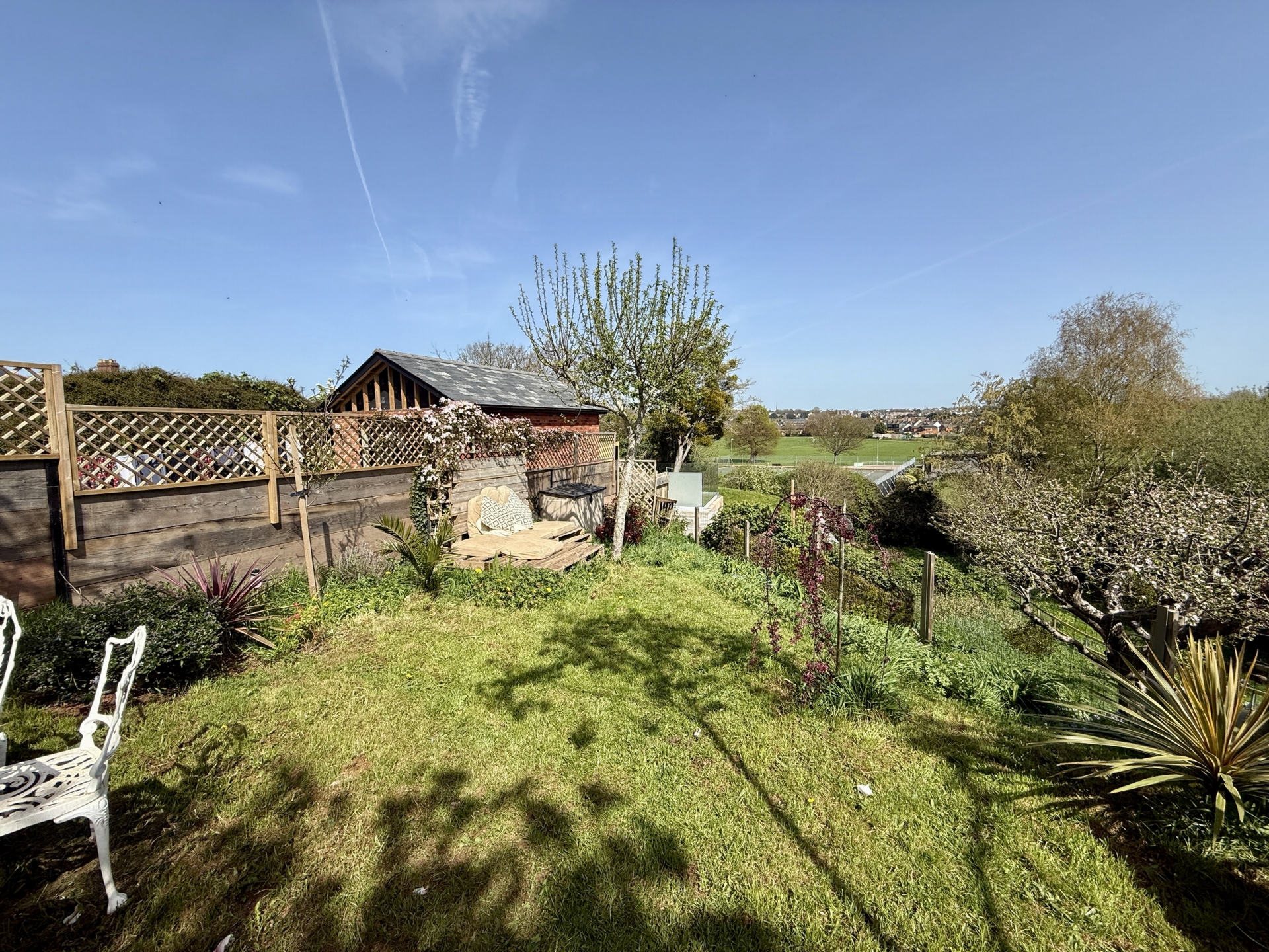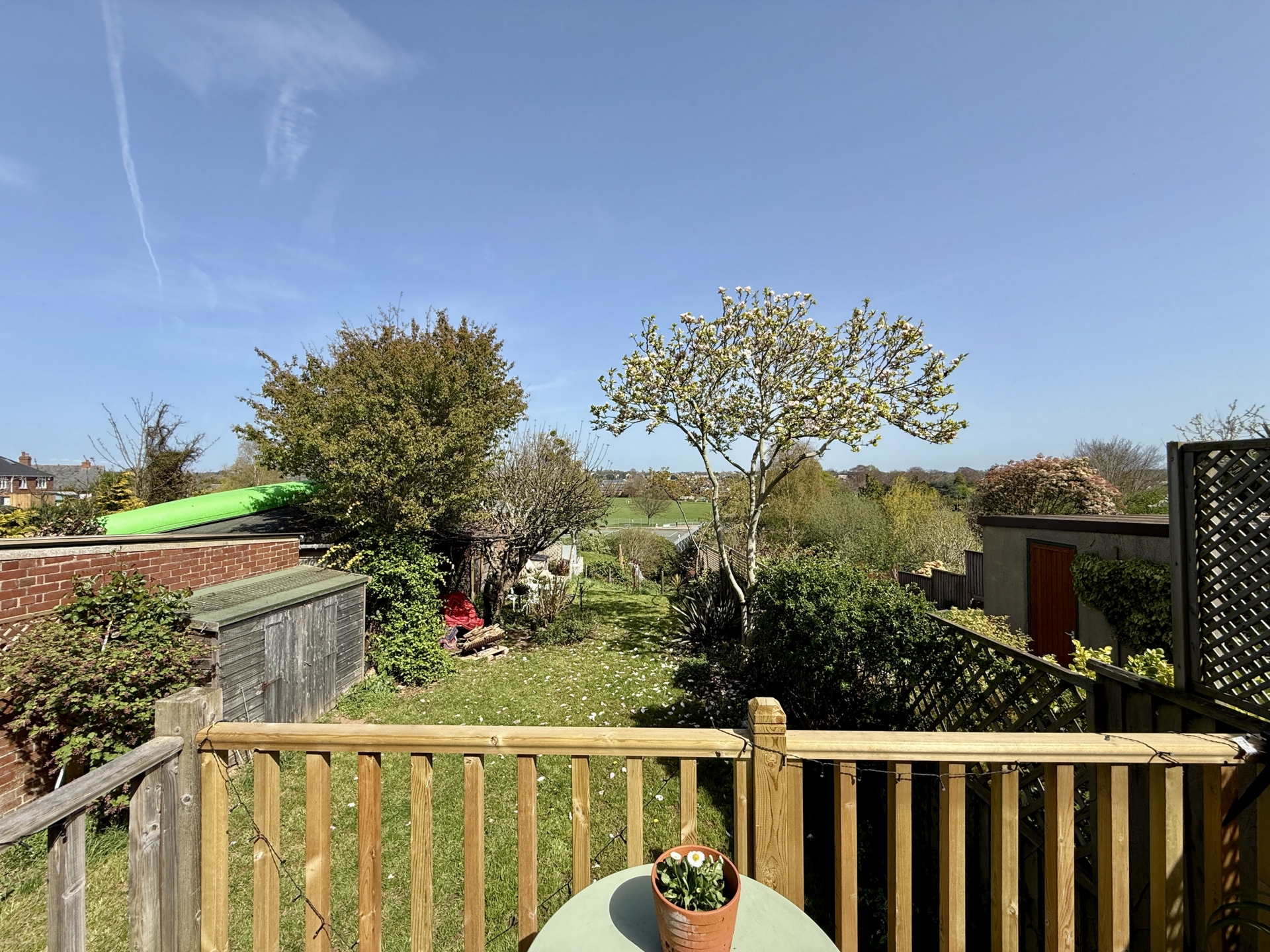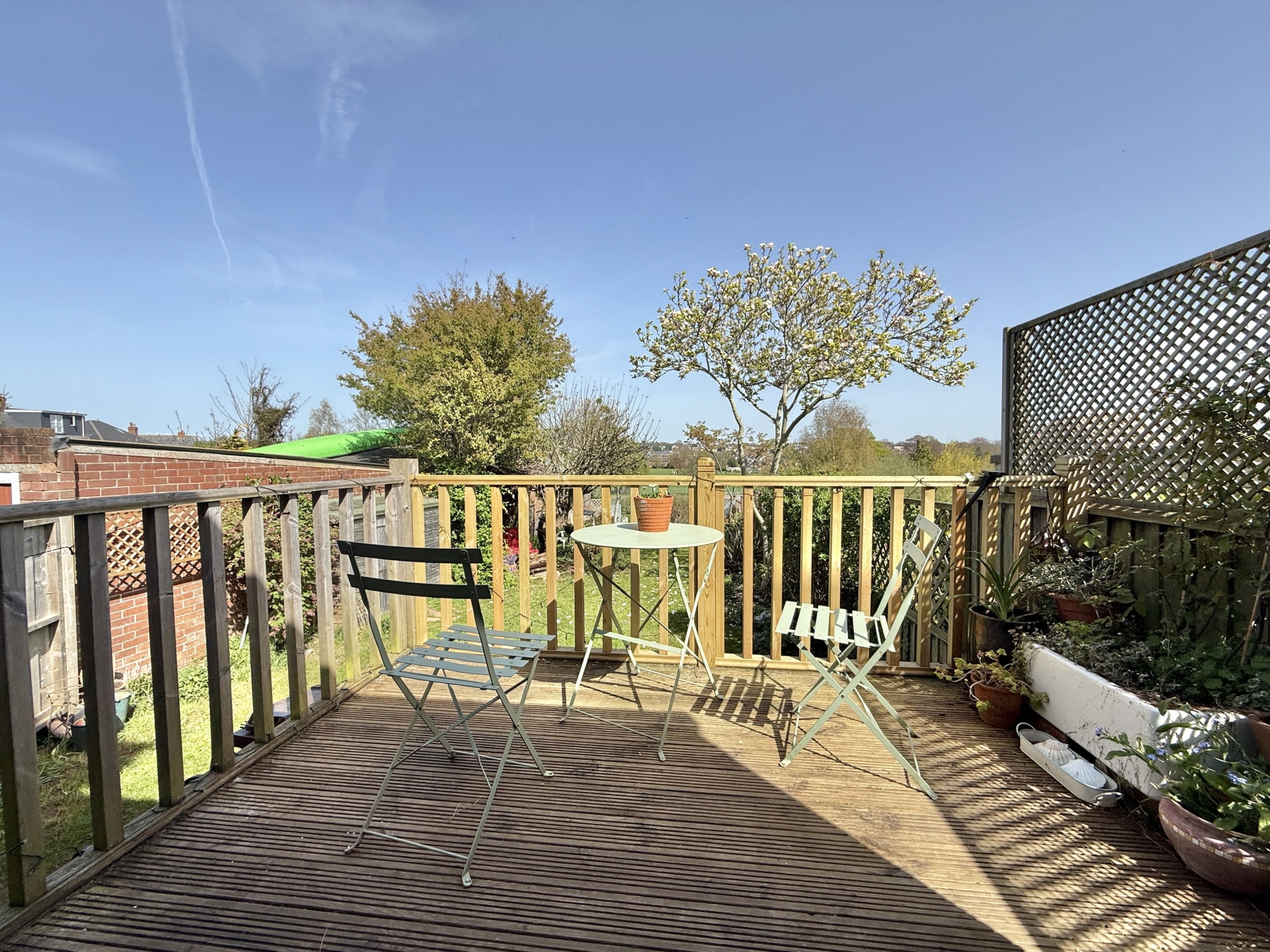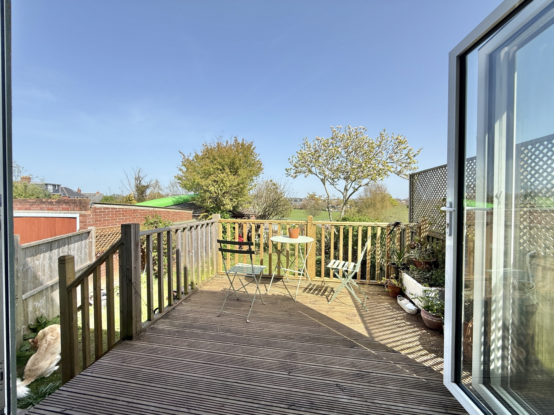 OUTSIDE: To the front a pathway leads to the front door with hedgerow and section of grass. A shared driveway leads to the rear garden which is a particular feature of this property with raised decked patio, perfect for alfresco dining and entertaining. Steps lead down to a good size lawn bordered by mature shrubs and trees with views over the neighbouring play fields.