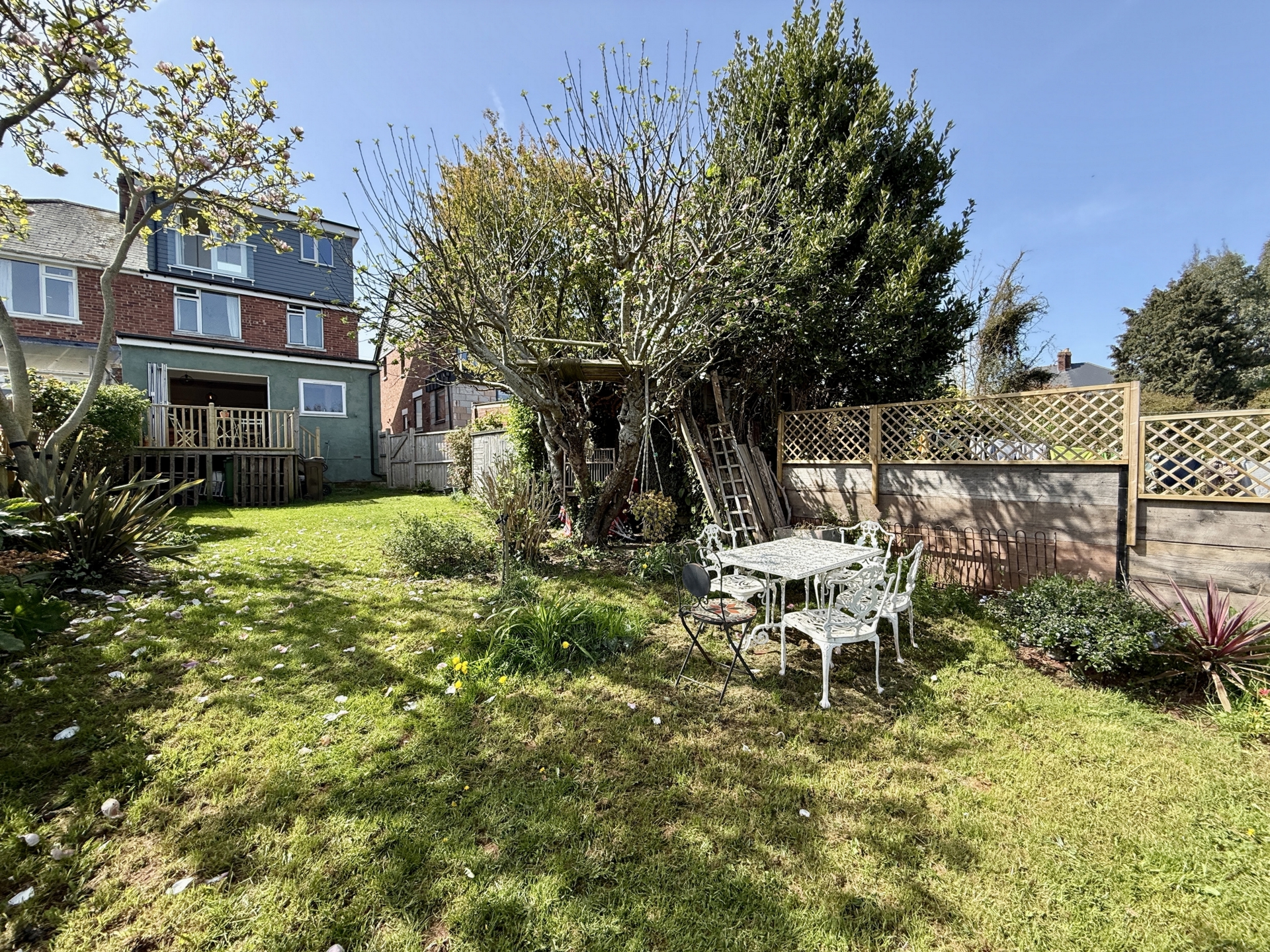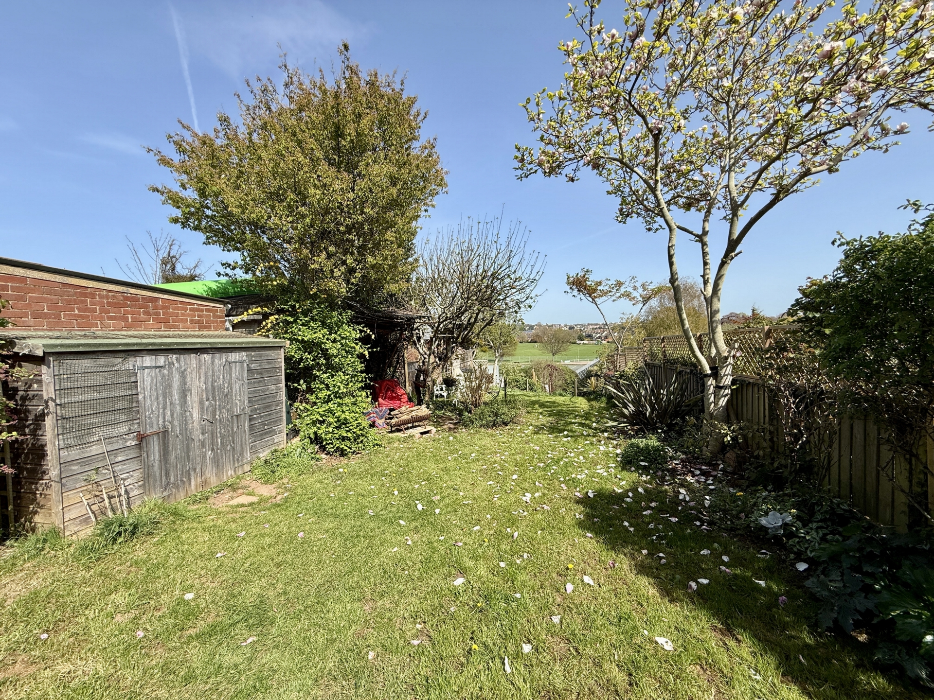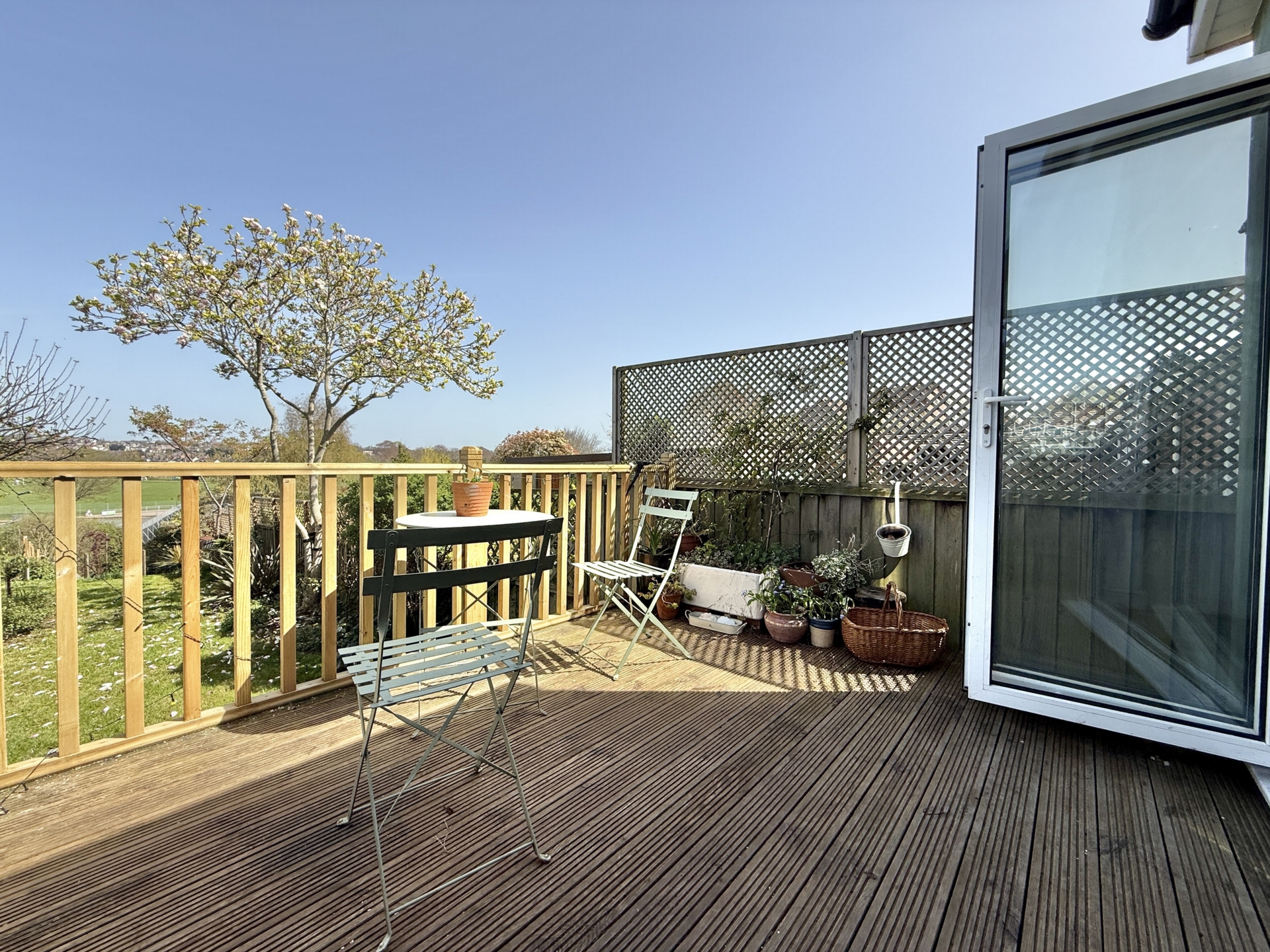 OUTSIDE: To the front a pathway leads to the front door with hedgerow and section of grass. A shared driveway leads to the rear garden which is a particular feature of this property with raised decked patio, perfect for alfresco dining and entertaining. Steps lead down to a good size lawn bordered by mature shrubs and trees with views over the neighbouring play fields.