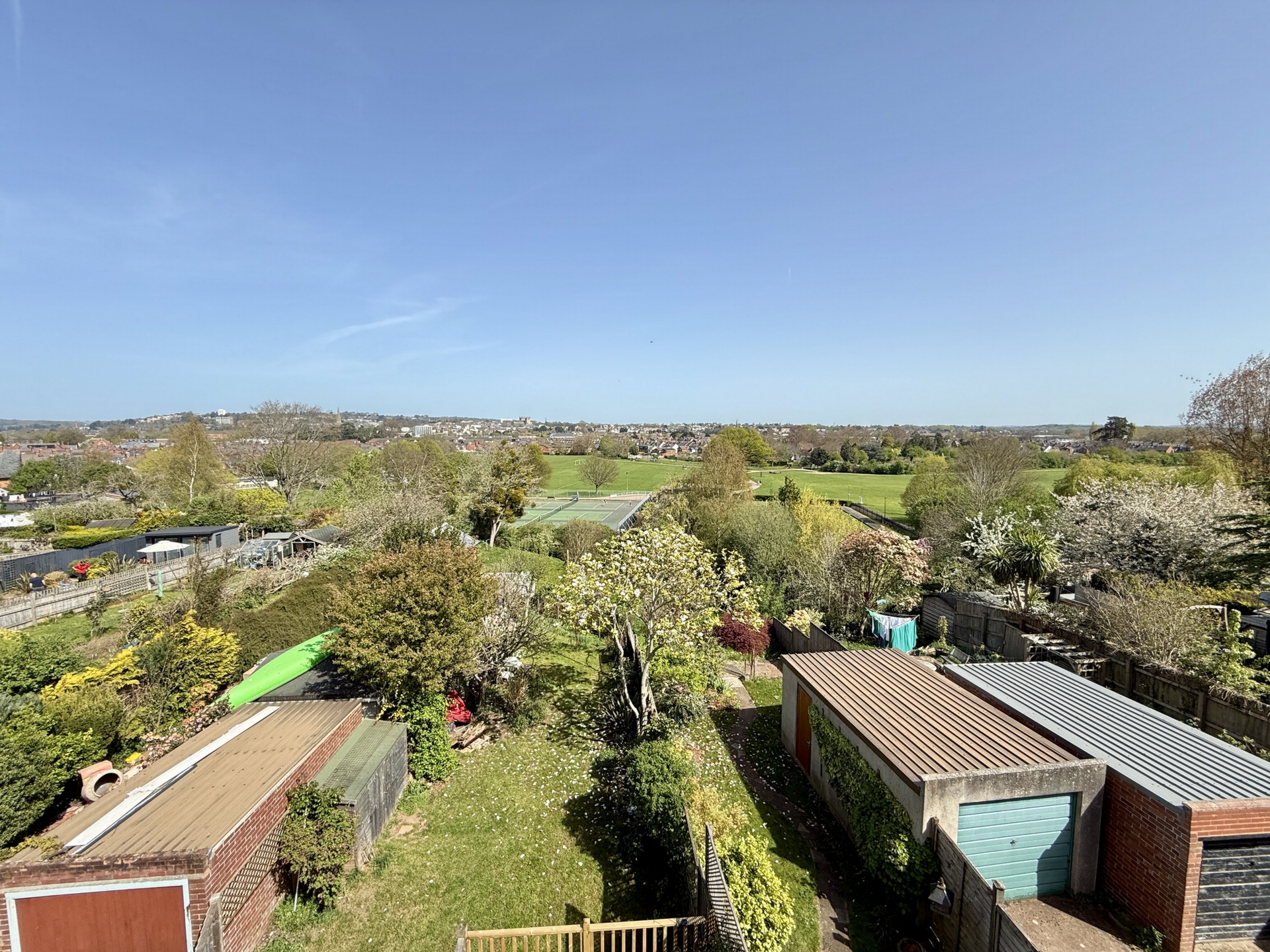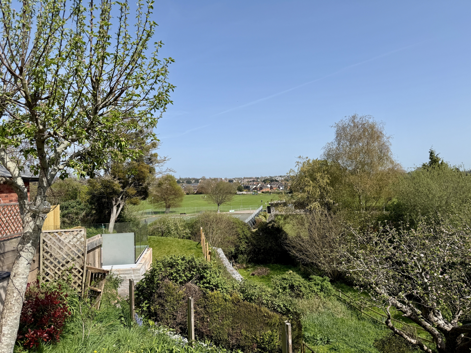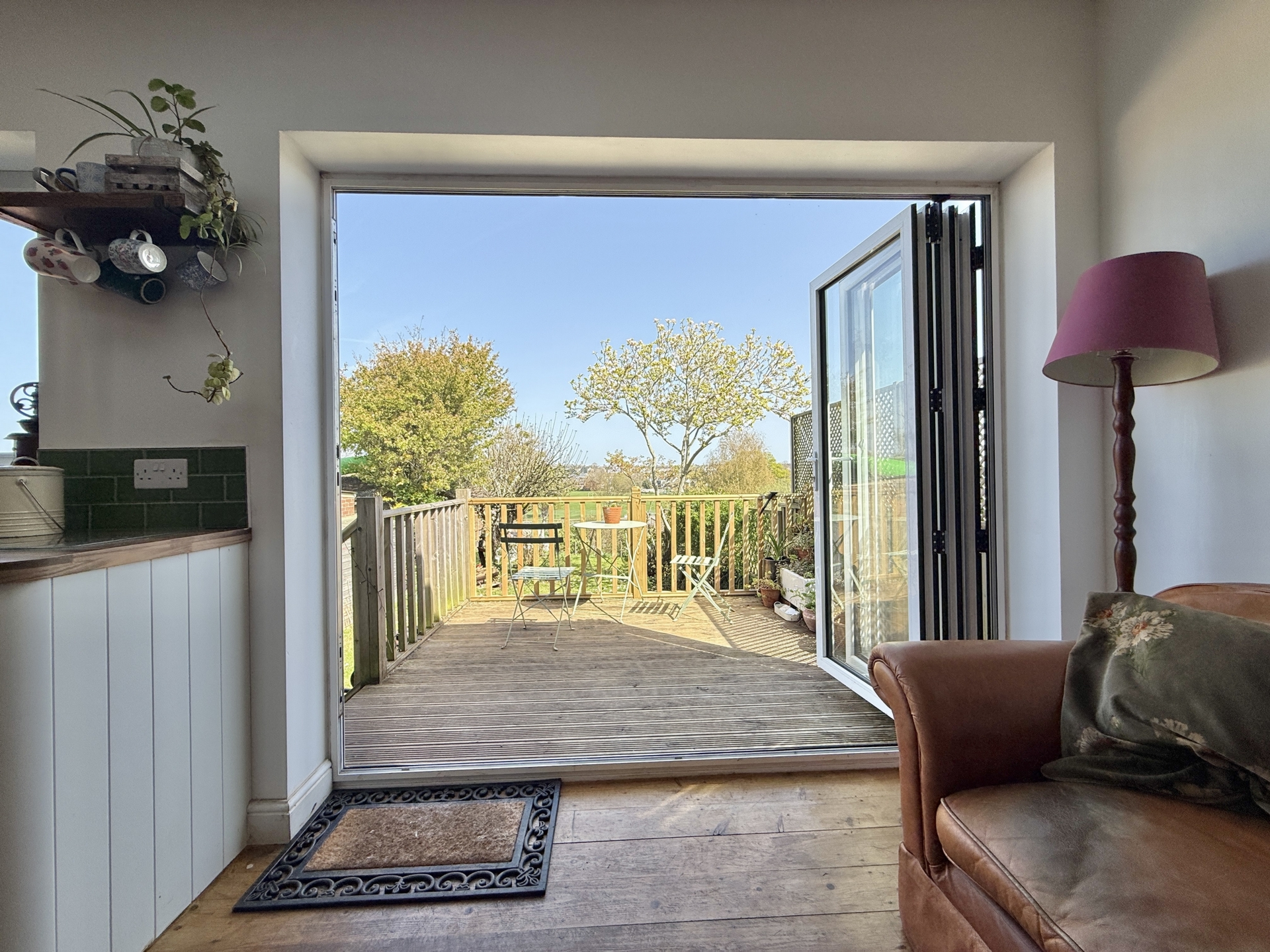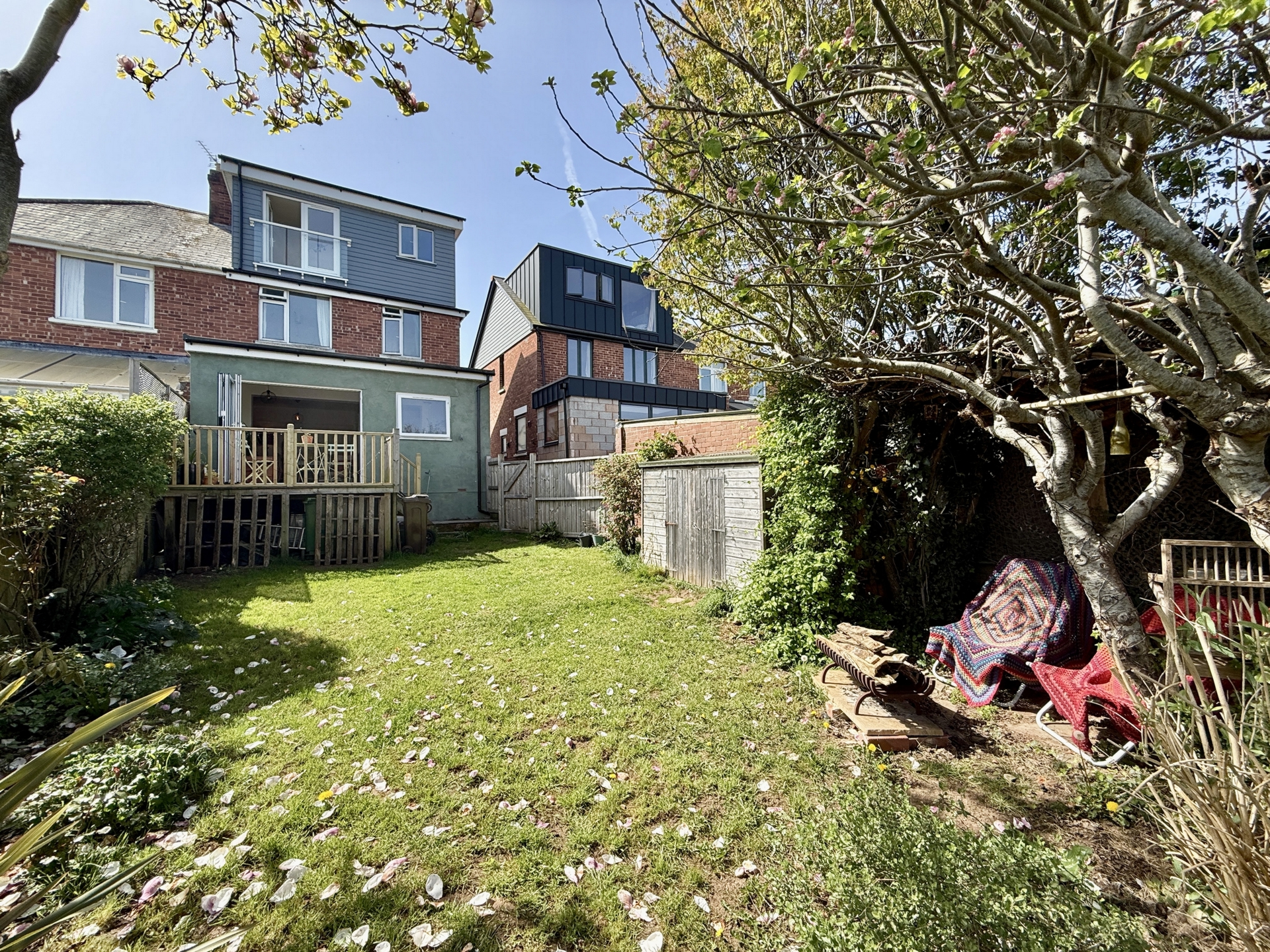 OUTSIDE: To the front a pathway leads to the front door with hedgerow and section of grass. A shared driveway leads to the rear garden which is a particular feature of this property with raised decked patio, perfect for alfresco dining and entertaining. Steps lead down to a good size lawn bordered by mature shrubs and trees with views over the neighbouring play fields.