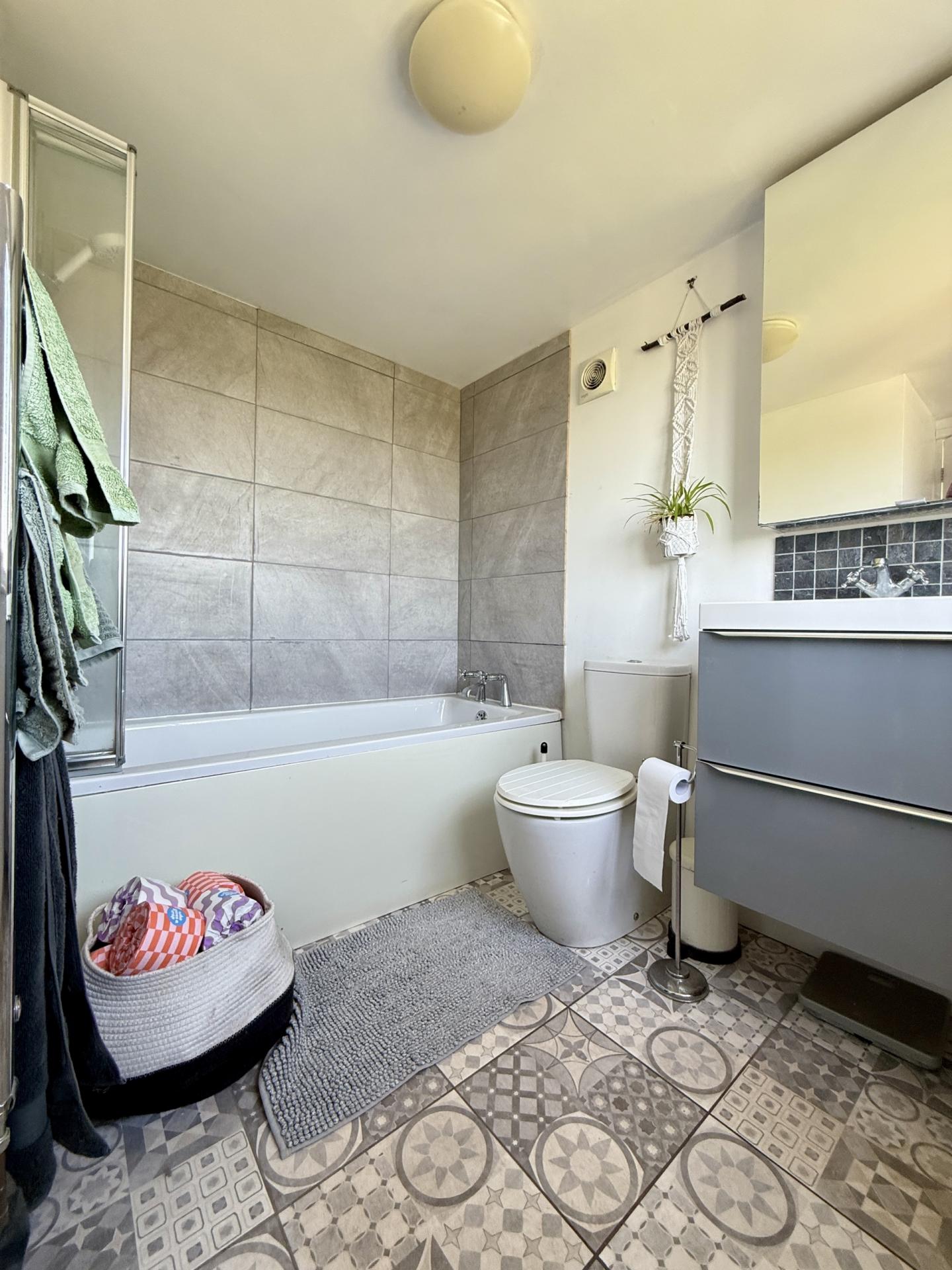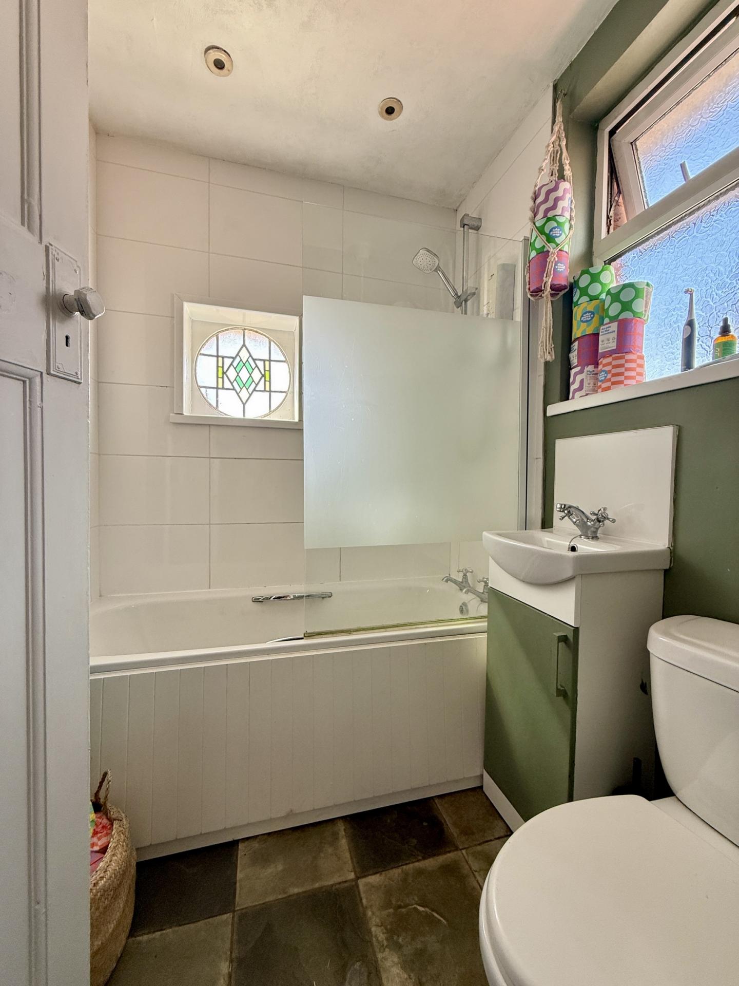 BATHROOM: Close coupled WC, wash hand basin, panelled bath with shower over, radiator, double glazed window to the side.