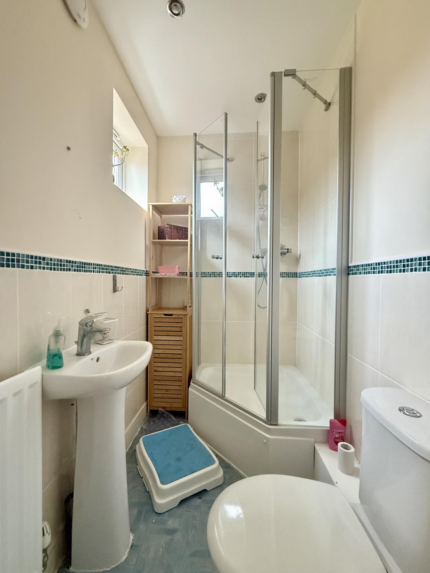 EN-SUITE: Close coupled WC, shower cubicle, pedestal wash hand basin, radiator.