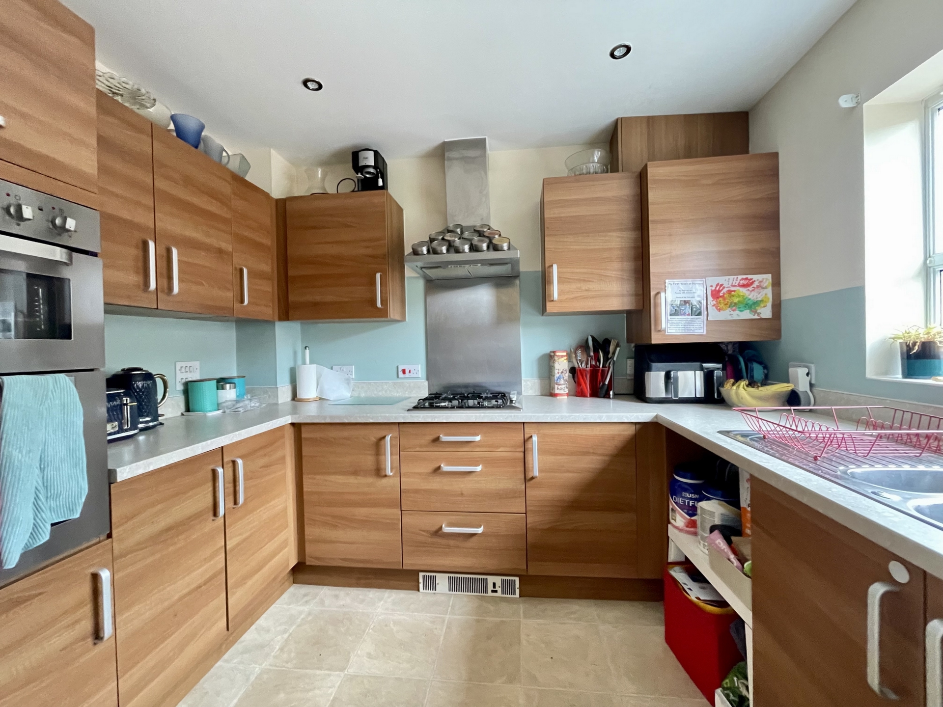 KITCHEN: 3.0m x 2.8m (9'10" x 9'2"), Base cupboards and drawers with worktop over, sink and drainer, built in oven and hob with hood over, space for fridge freezer, space for dishwasher, wall mounted cupboards, double glazed window to the front.
