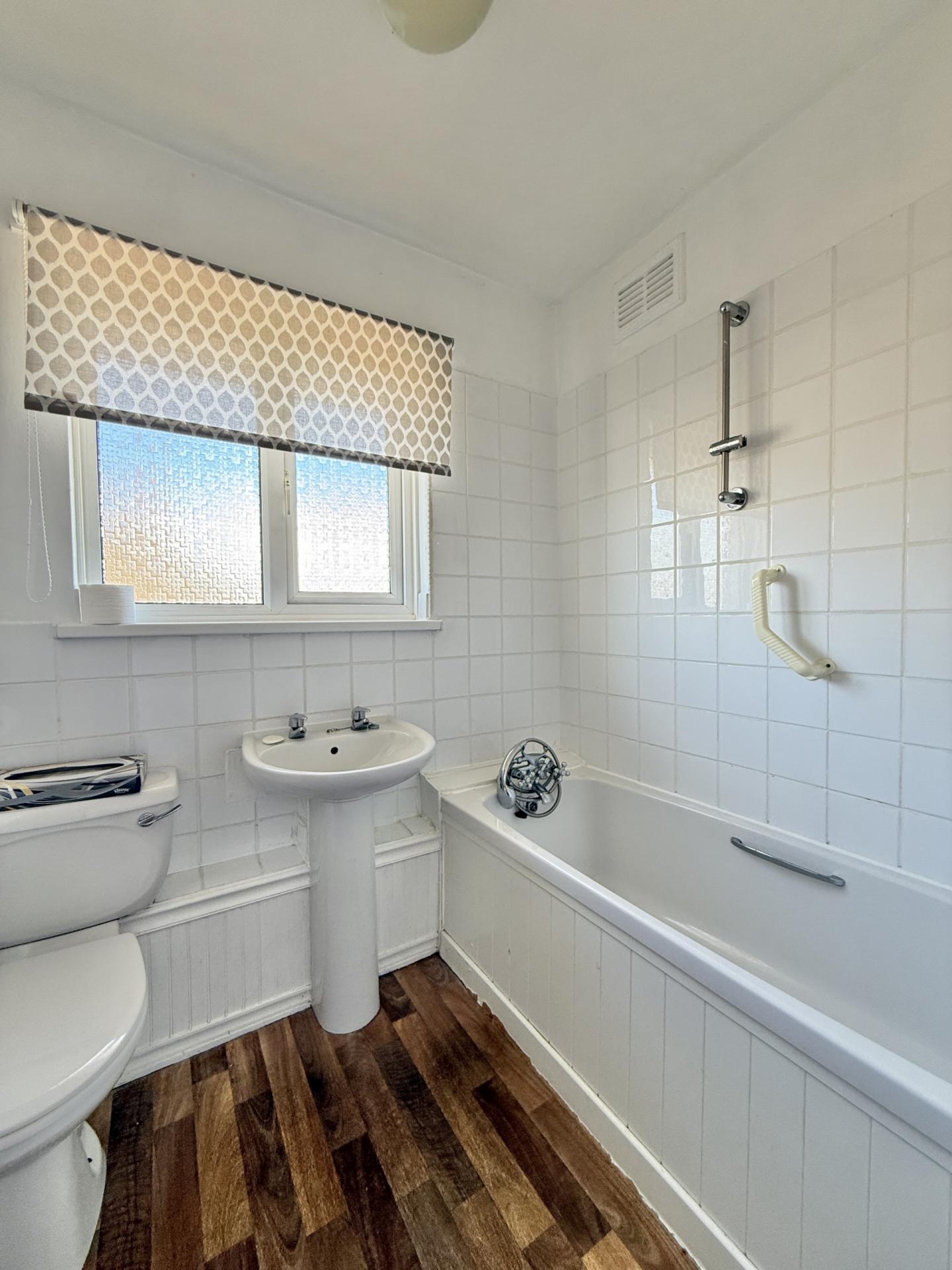 BATHROOM: Pedestal wash hand basin, close coupled WC, panelled bath, double glazed window to the side.