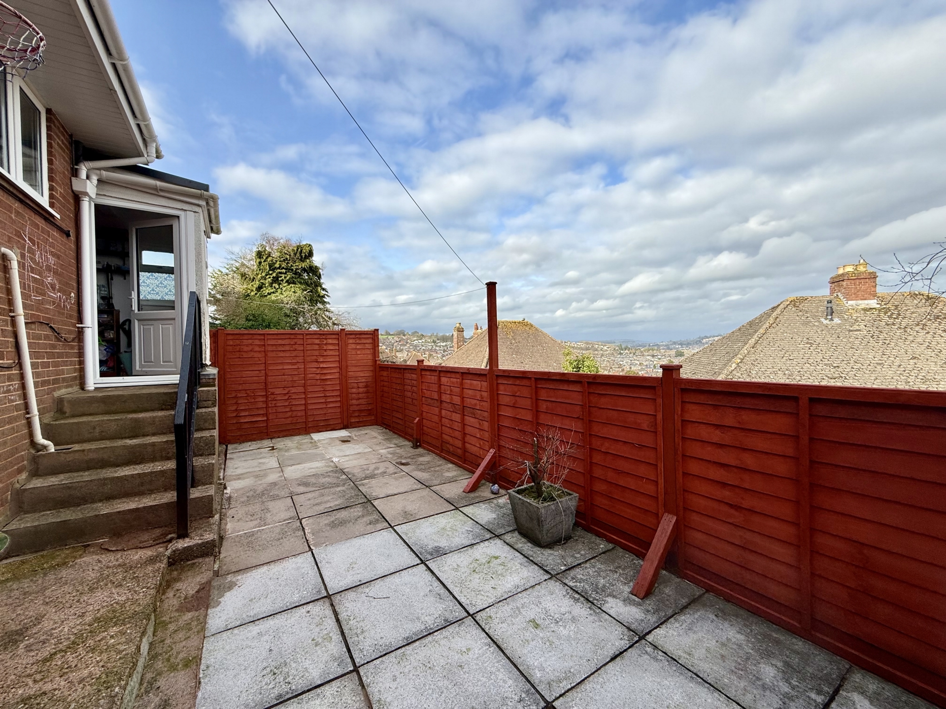OUTSIDE: To the front of the property steps lead down to the front door with area of grass lawn and mature shrubs, plants and hedgerow. To the rear of the property is a paved patio area perfect for alfresco dining to enjoy the far reaching views over parts of the City.
