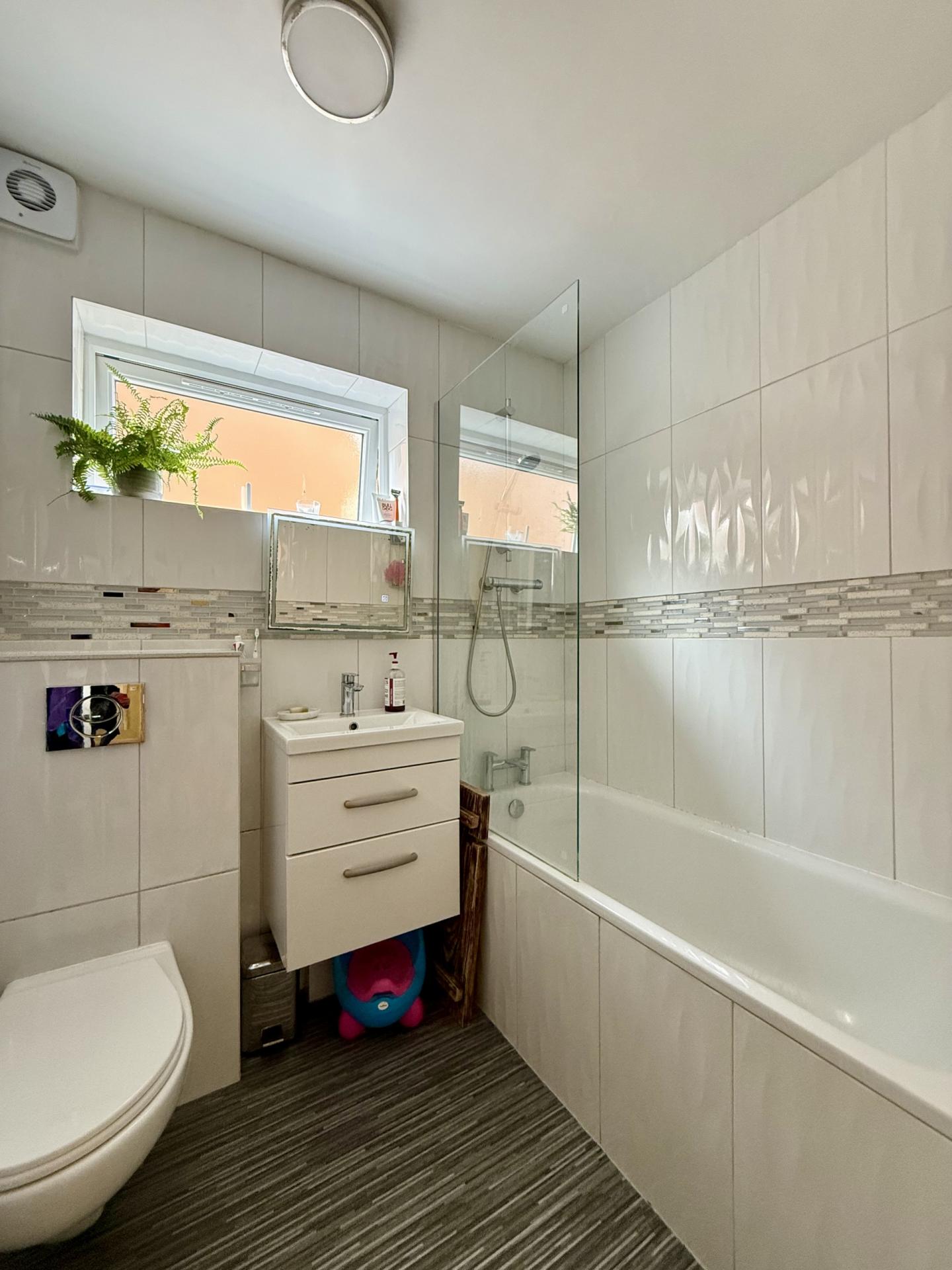 BATHROOM: Wash hand basin, WC with concealed cistern, panelled bath with shower over, heated towel rail, obscure double glazed window to the side.