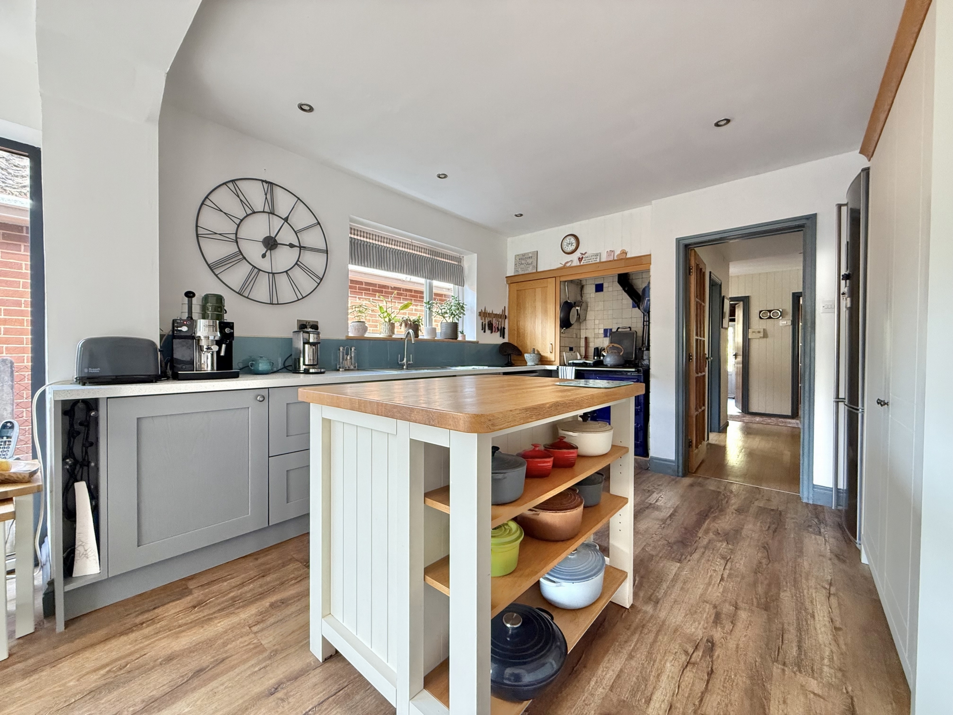 KITCHEN/DINING/LIVING ROOM: 6.5m x 3.5m (21'4" x 11'6"), Base cupboards and drawers with worktop over, sink and drainer, Rayburn oven with separate hob, space for dishwasher, usefull island with storage under, space for fridge freezer, larder cupboard with shelves, drawers and lighting, double glazed window to the side, double glazed sliding door to the rear garden.