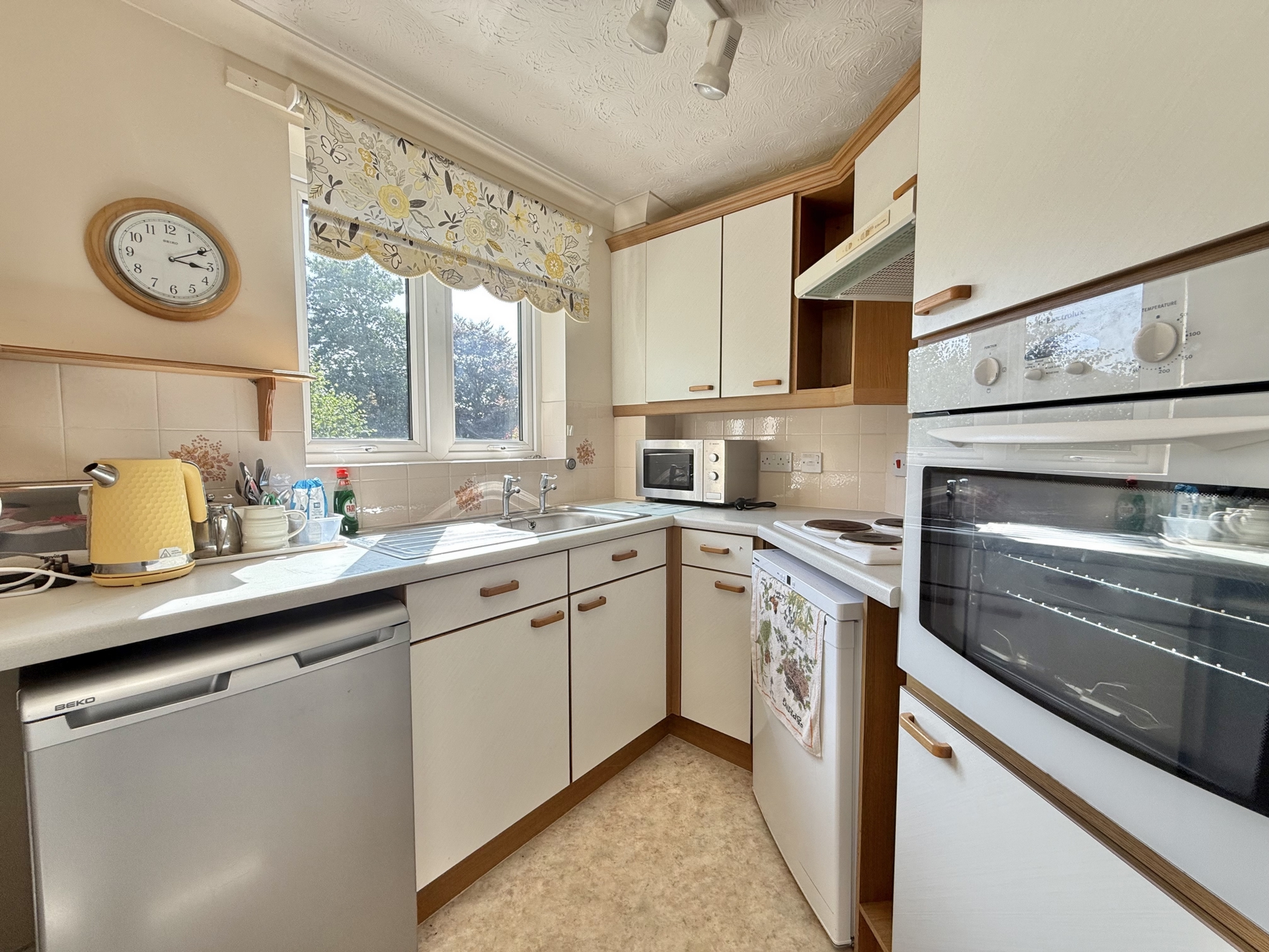 KITCHEN: 2.3m x 1.9m (7'7" x 6'3") Irregular shaped room, Base cupboards and drawers with worktop over, sink and drainer, built in oven and hob with extractor over, space for low level fridge, wall mounted cupboards, double glazed window, security pull cord.