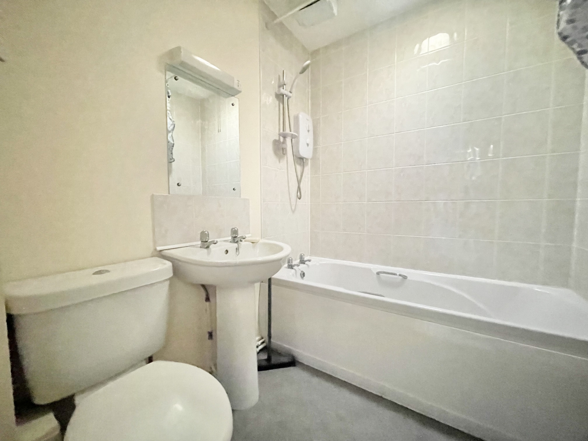 BATHROOM: Close coupled WC, wash hand basin, panelled bath with electric shower, sky light.