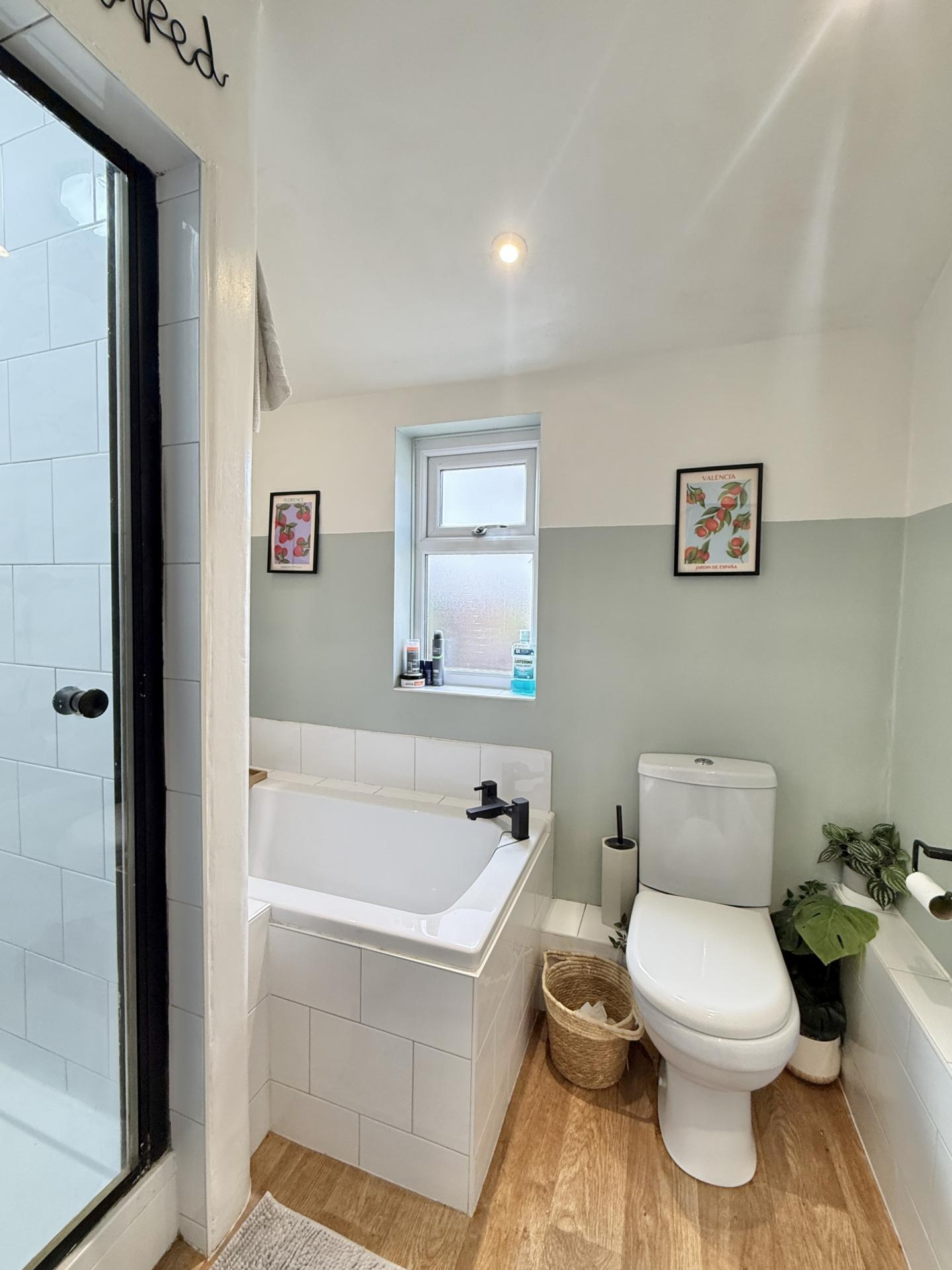 BATHROOM: Tiled panel bath, separate shower cubicle, close coupled WC, pedestal wash hand basin, double glazed window to the rear.