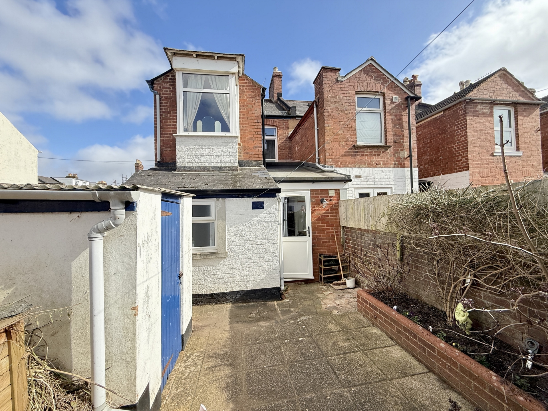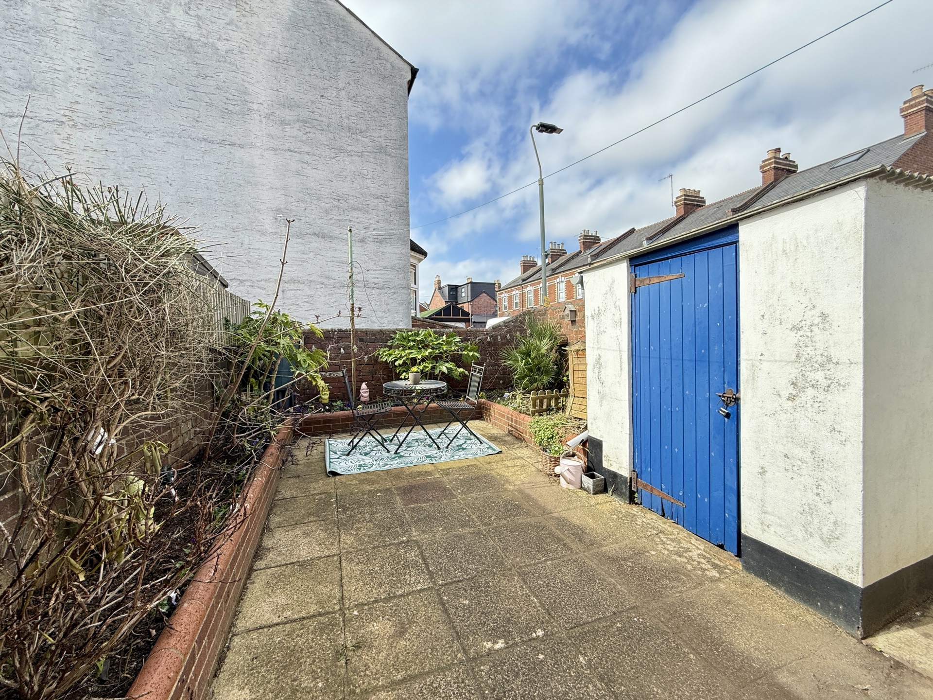 OUTSIDE: To the rear is a courtyard garden laid to paved with patio with raised flower beds and handy storage cupboard. There is also a gate providing rear access.