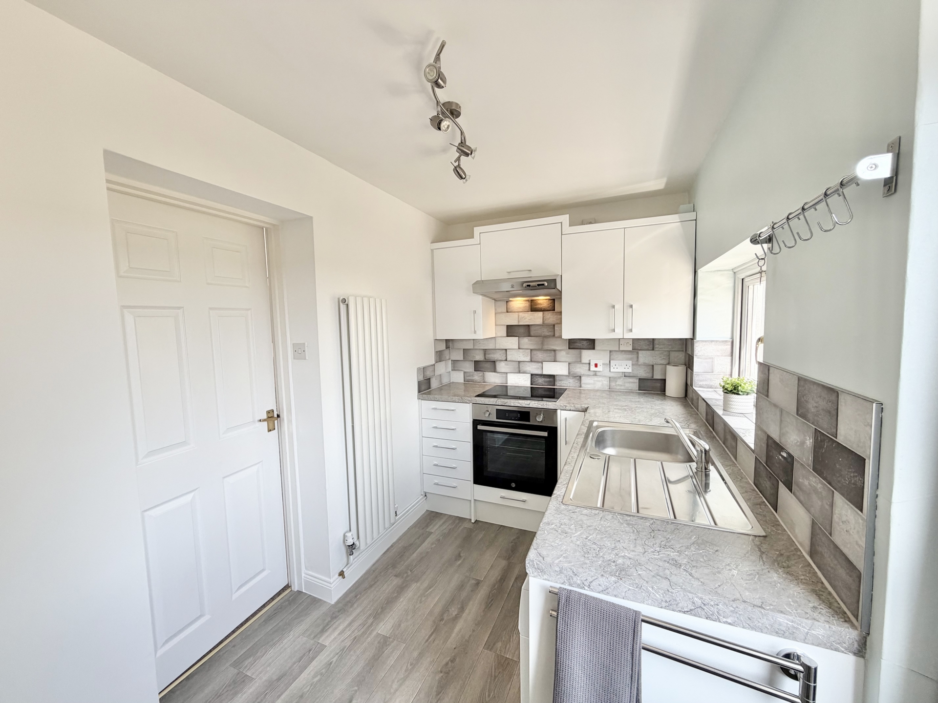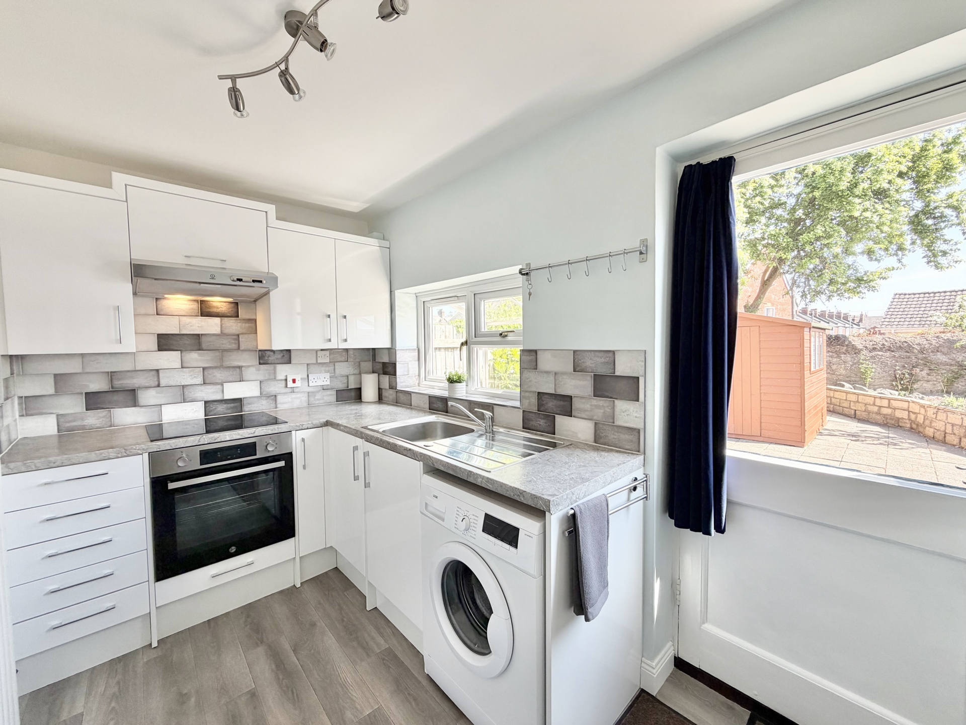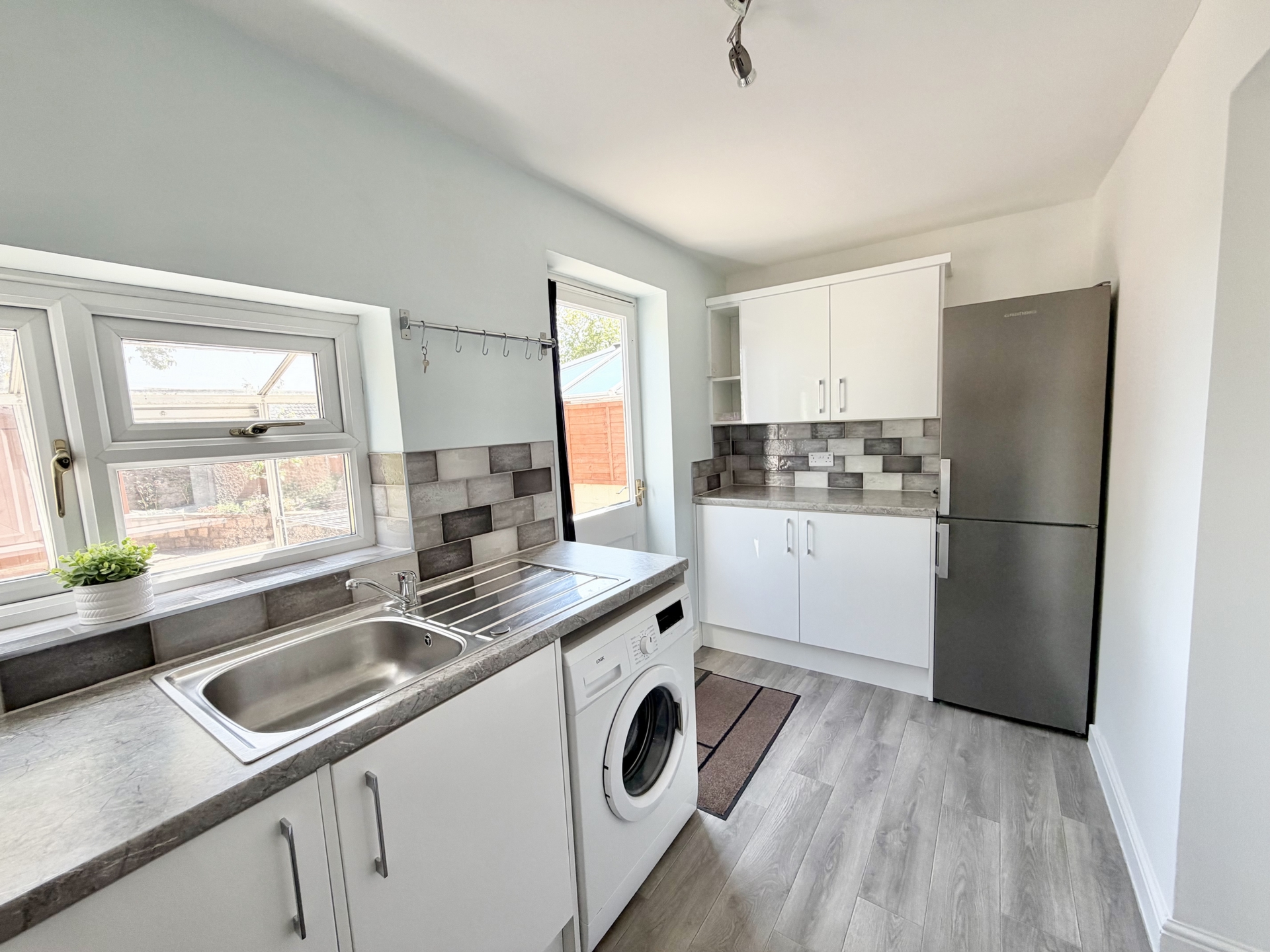KITCHEN: Base cupboards and drawers with worktop over, sink and drainer with mixer tap, fridge freezer, washing machine, built in electric oven, hob and extractor over, wall mounted cupboards, double glazed window to the rear, door to the rear garden.
