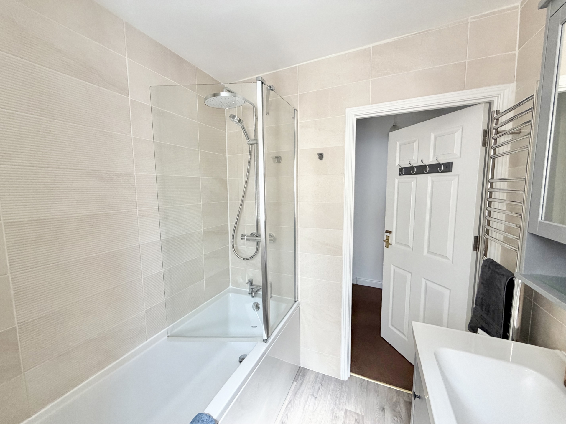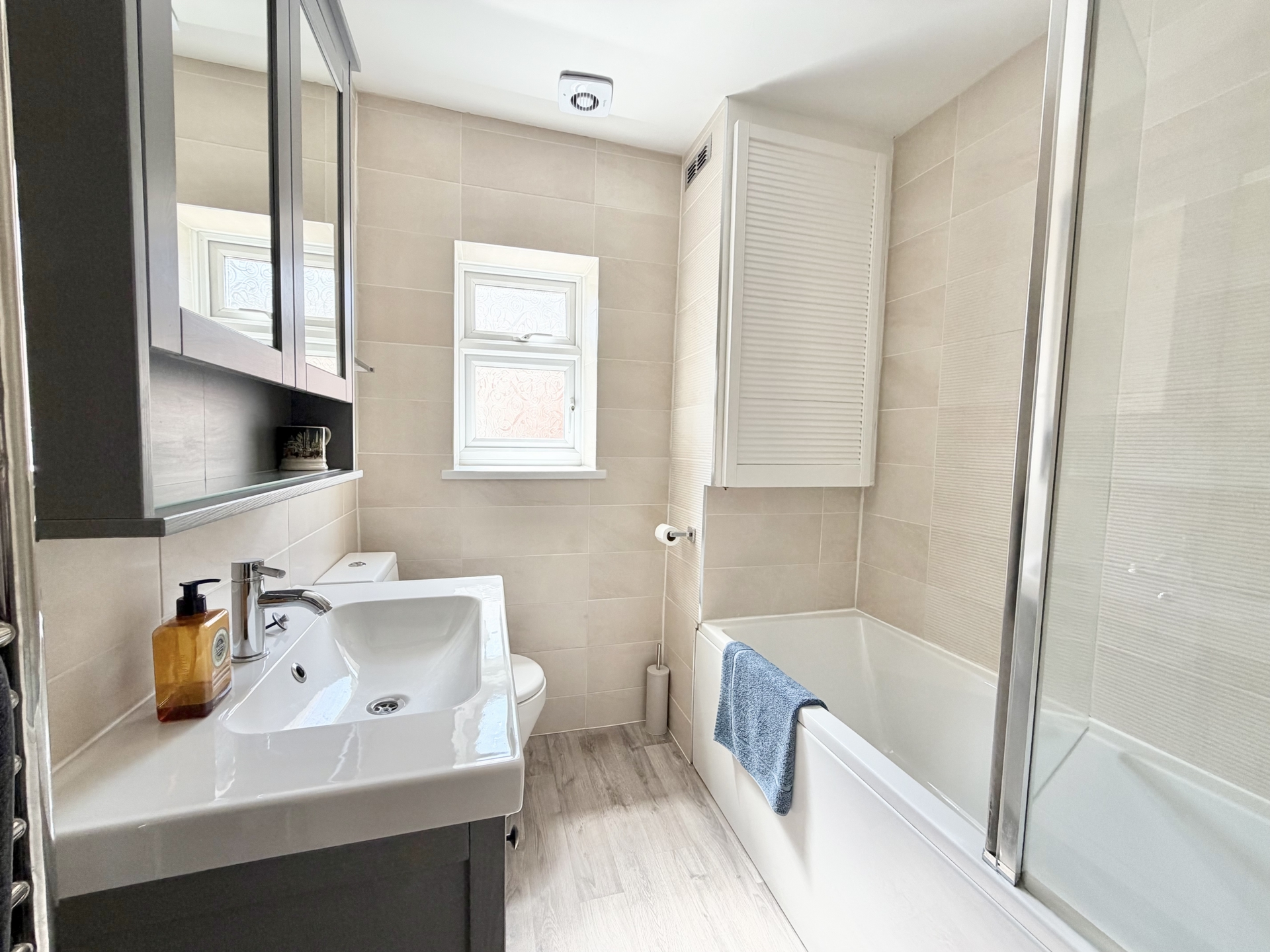 BATHROOM: Close coupled WC, wash hand basin with storage under, panelled bath with shower over, cupboard housing wall mounted boiler, obscure double glazed window to the side, heated towel rail.