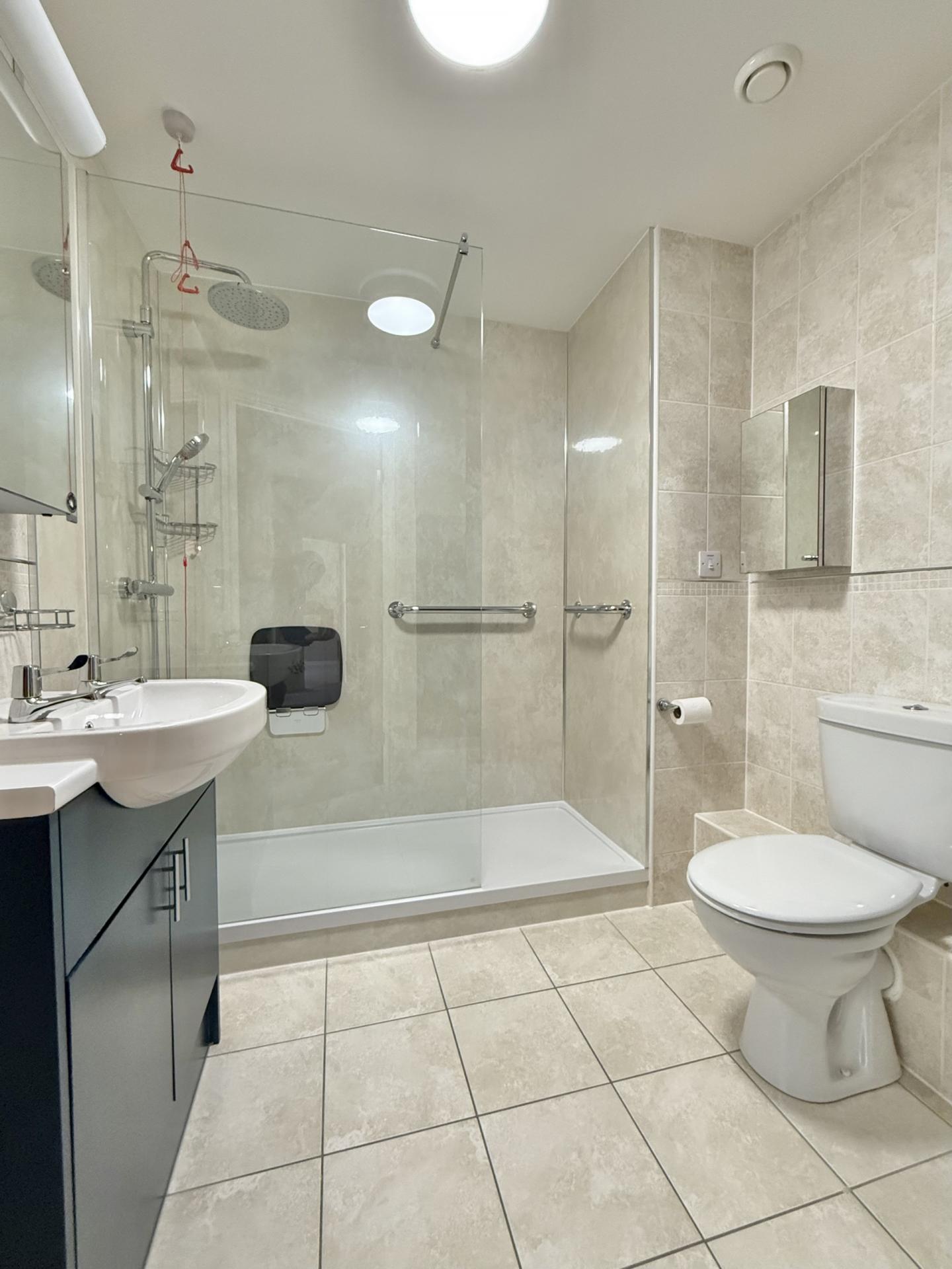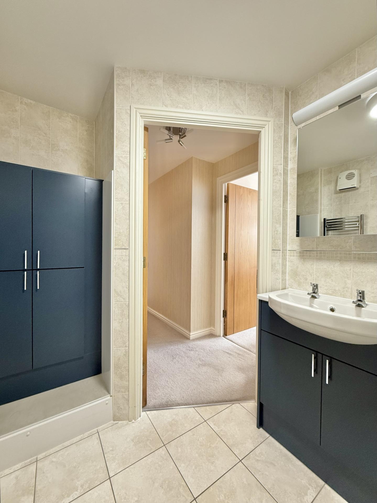 SHOWER ROOM: Close coupled WC, wash hand basin with storage cupboard under, walk in shower, towel rail, built in storage cupboard, security pull chord.