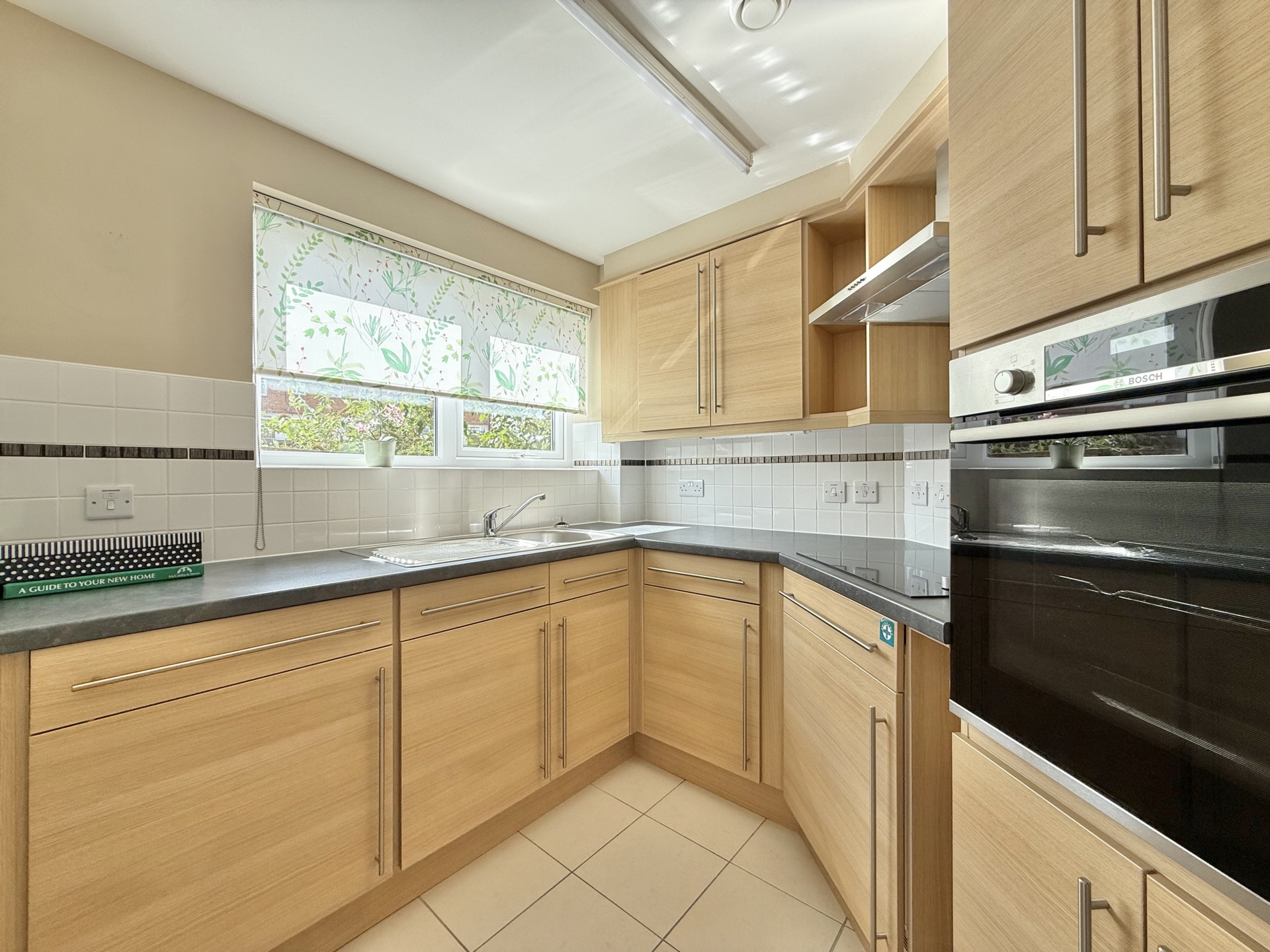 KITCHEN: 2.3m x 2.2m (7'7" x 7'3") Irreguar shaped room, maximum, Base cupboards and drawers with worktop over, built in oven with separate hob and hood over, sink and drainer, wall mounted cupboards, built in fridge, double glazed window.