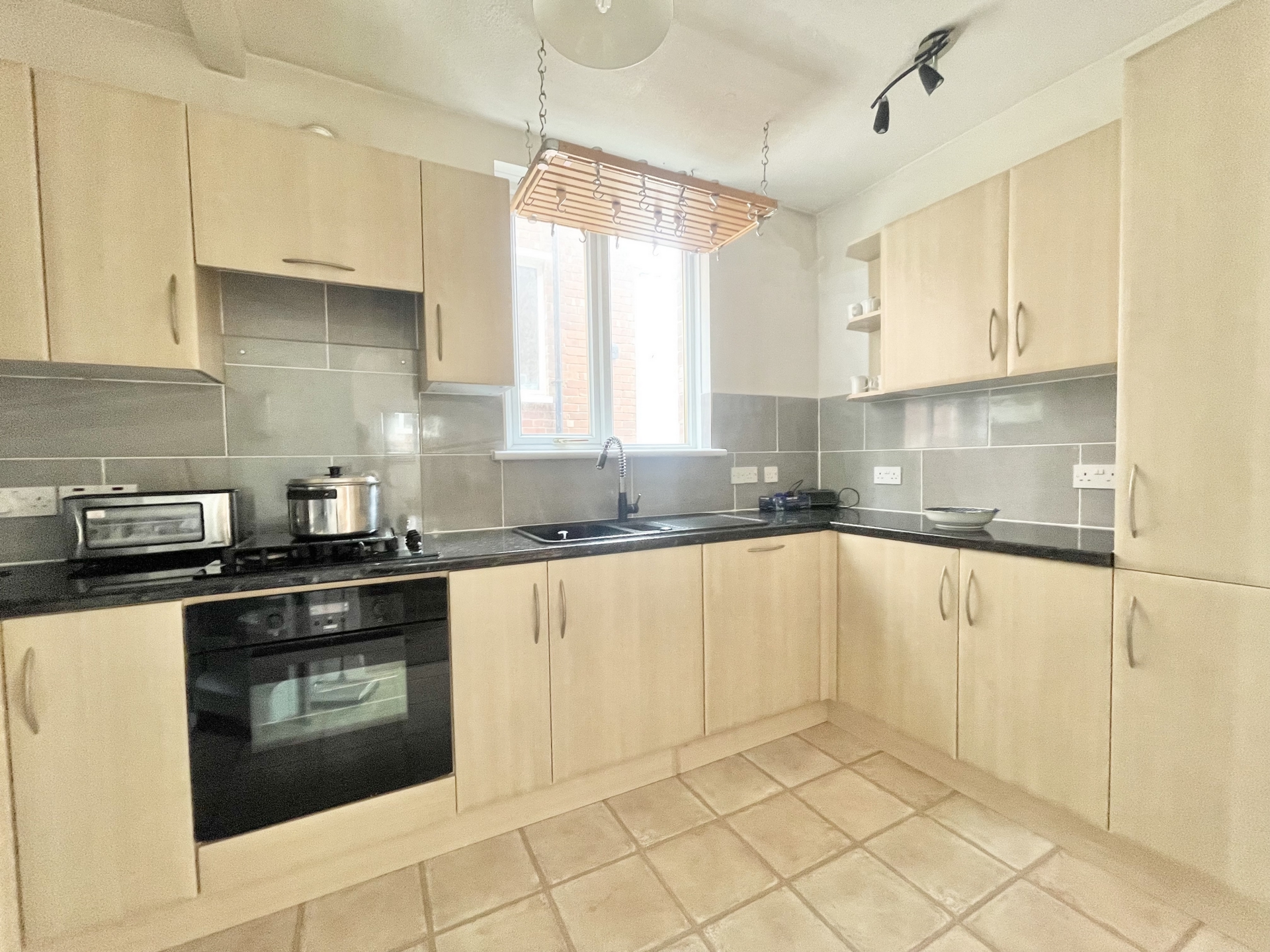 KITCHEN: 3.6m x 2.1m (11'10" x 6'11"), Base cupboards and drawers with worktop over, one and a half bowl sink and drainer, built in oven and four ring gas hob with extractor over, built in dishwasher, space for low level fridge, wall mounted cupboards, double glazed window to the side.
