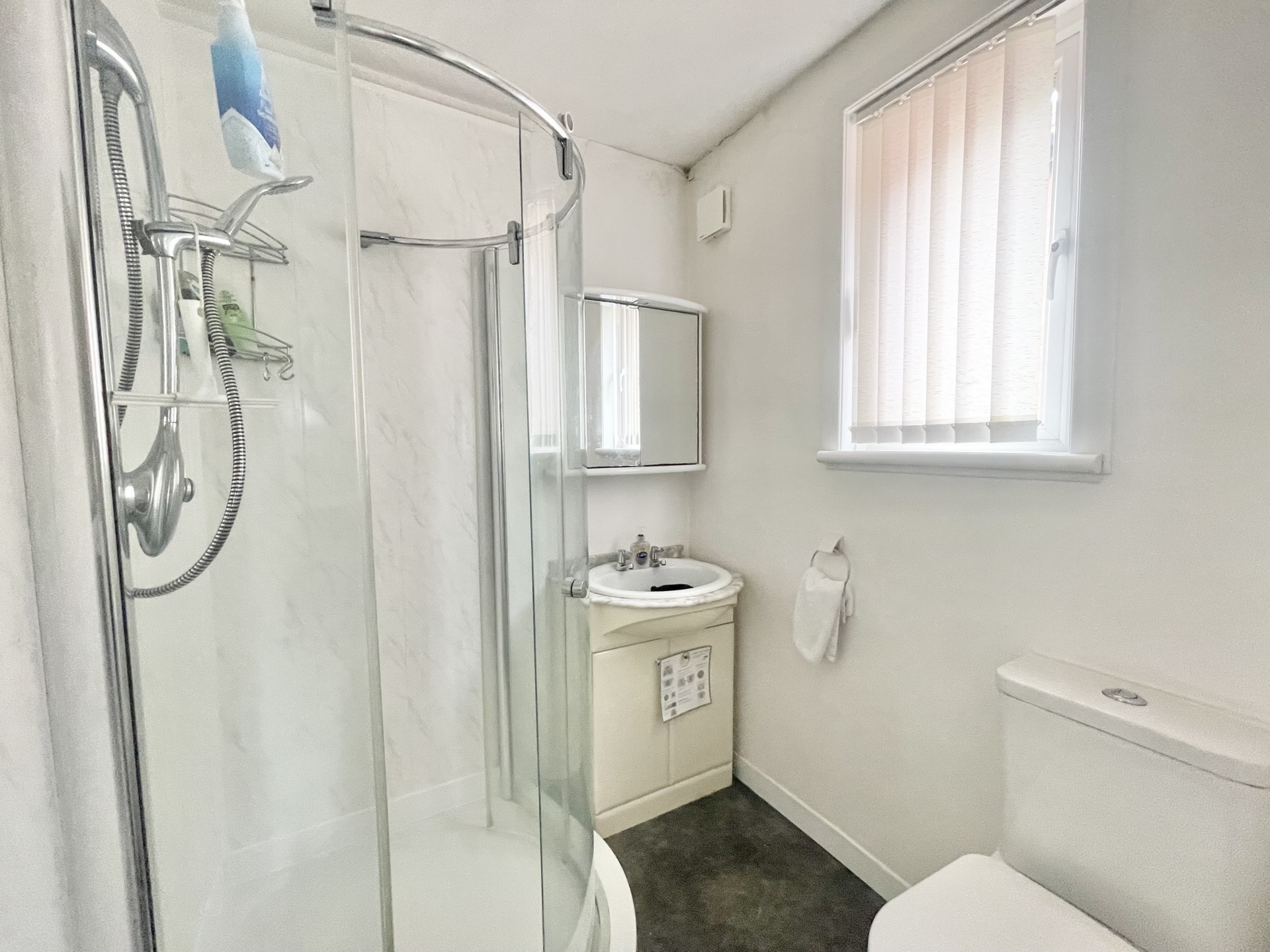 SHOWER ROOM: Close coupled WC, wash hand basin with storage under, shower cubicle with shower over, heated towel rail, double glazed window to the side.