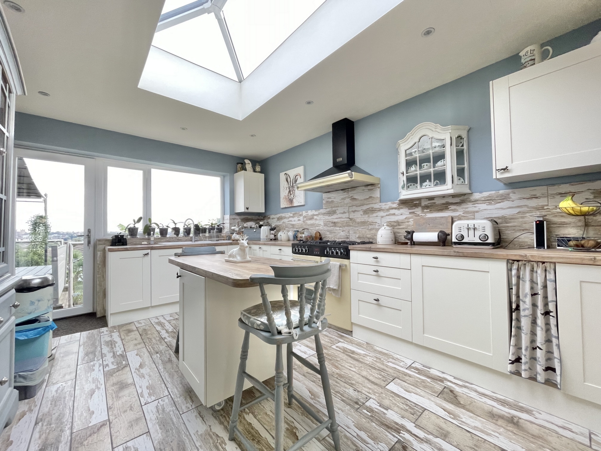 KITCHEN/DINER: 5.0m x 3.3m (16'5" x 10'10"), Base cupboards and drawers with worktop over, space for cooker with hood over, sink and drainer, built in fridge and freezer, wall mounted cupboards, moveable unit with breakfast bar, radiator, double glazed window to the rear, double glazed door to the rear garden, roof window.