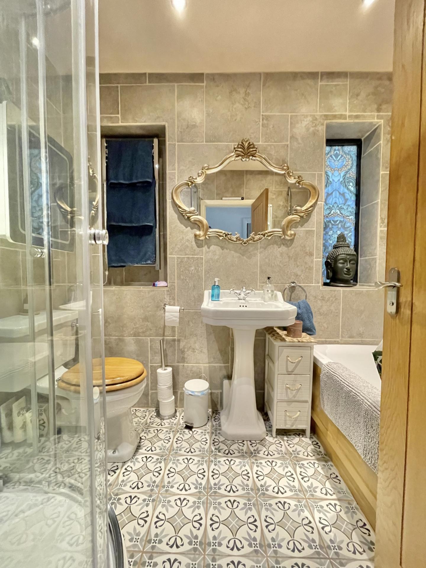 BATHROOM: Wooden panelled bath with shower over, pedestal wash hand basin, close coupled WC, shower cubicle, under floor heating.