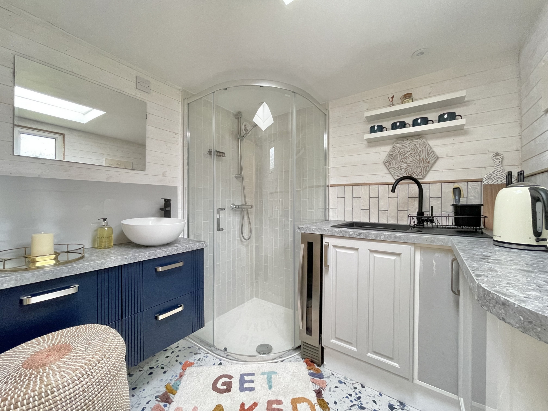 Shower cubicle, sink and drainer, storage cupboards, wash hand basin.