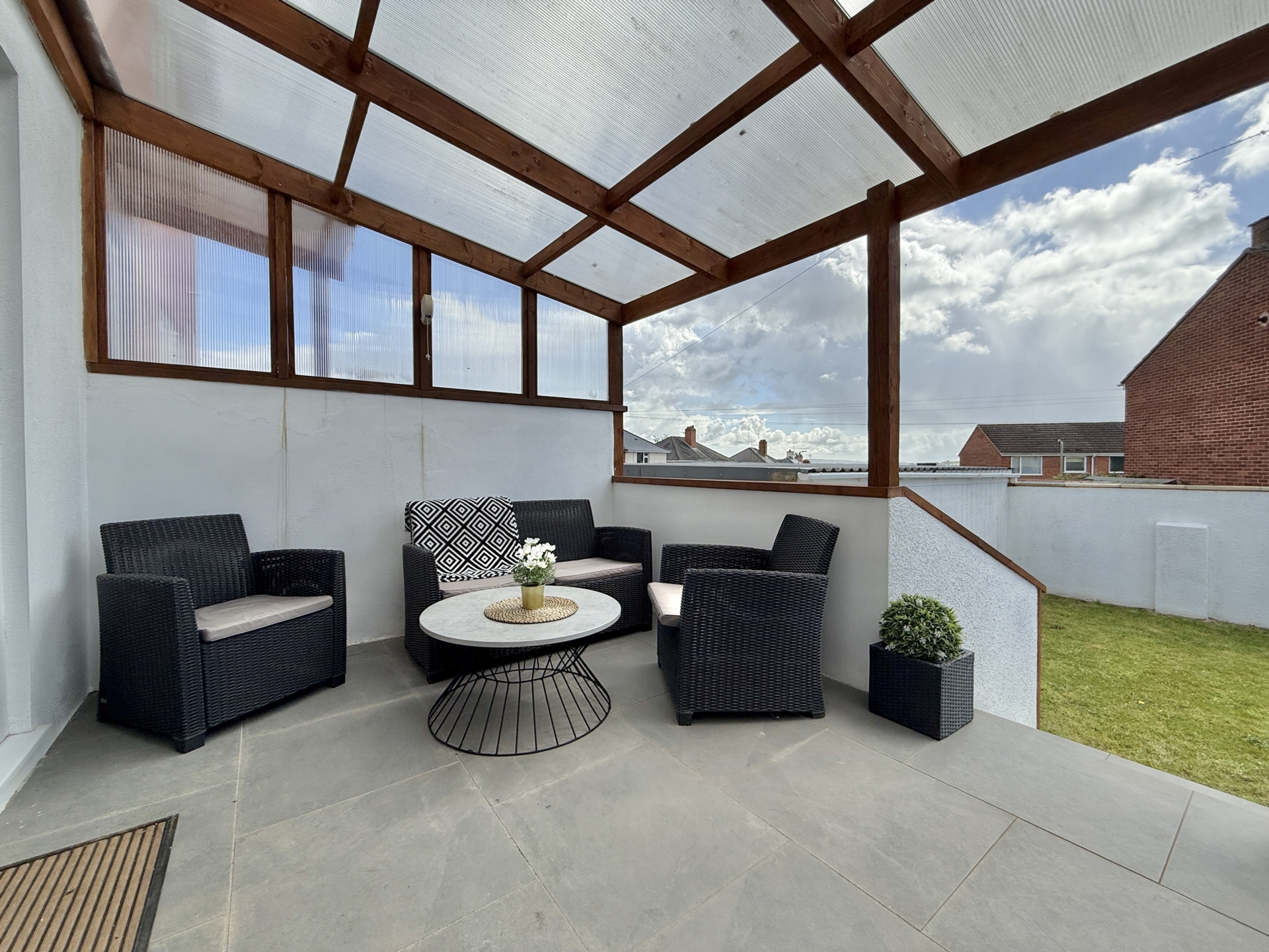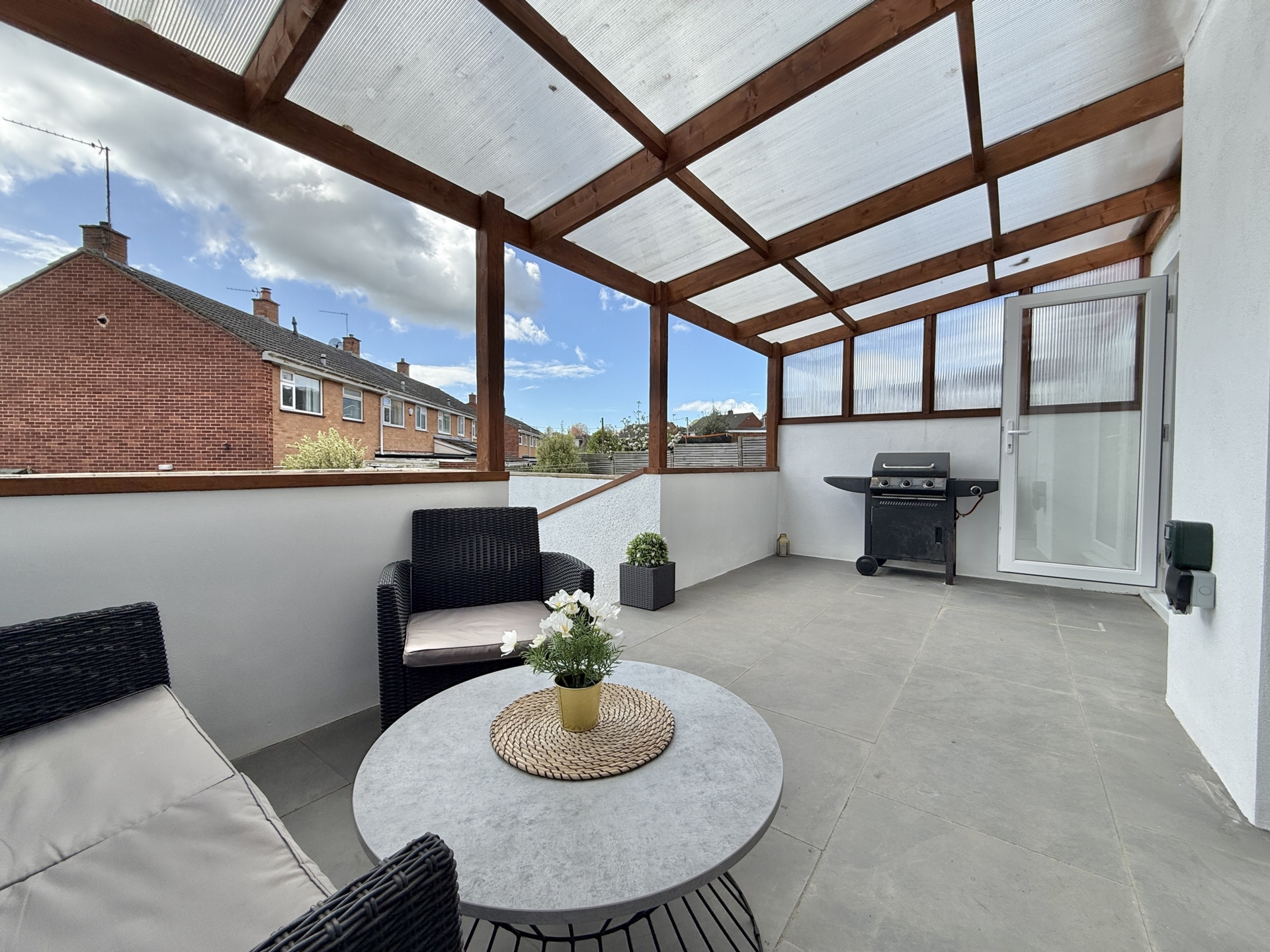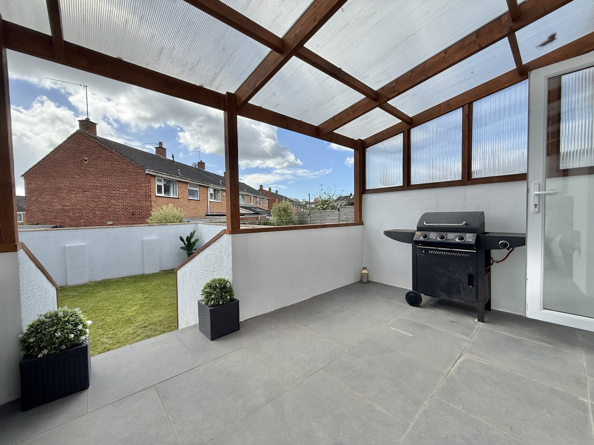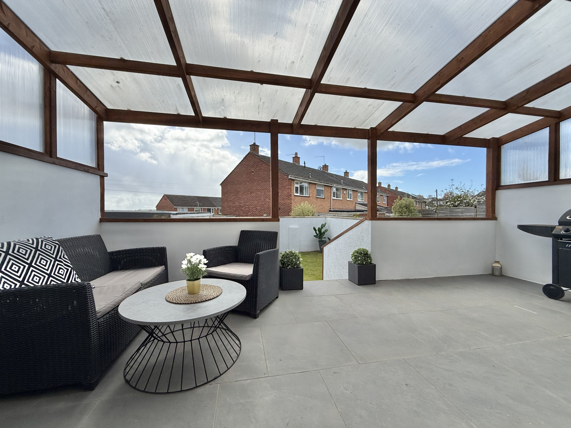 OUTSIDE: Occupying a desirable corner plot the garden features a lawned area to the front with steps leading down to a low maintenance section of stone chippings. This area provides access to the garage and a gate leading through to the rear garden. The rear garden offers a covered seating area, ideal for relaxing or entertaining,# with steps leading down to a further generously sized lawn. In addition, there is a dedicated space designed for outdoor cooking and entertaining creating a perfect setting for social gatherings.