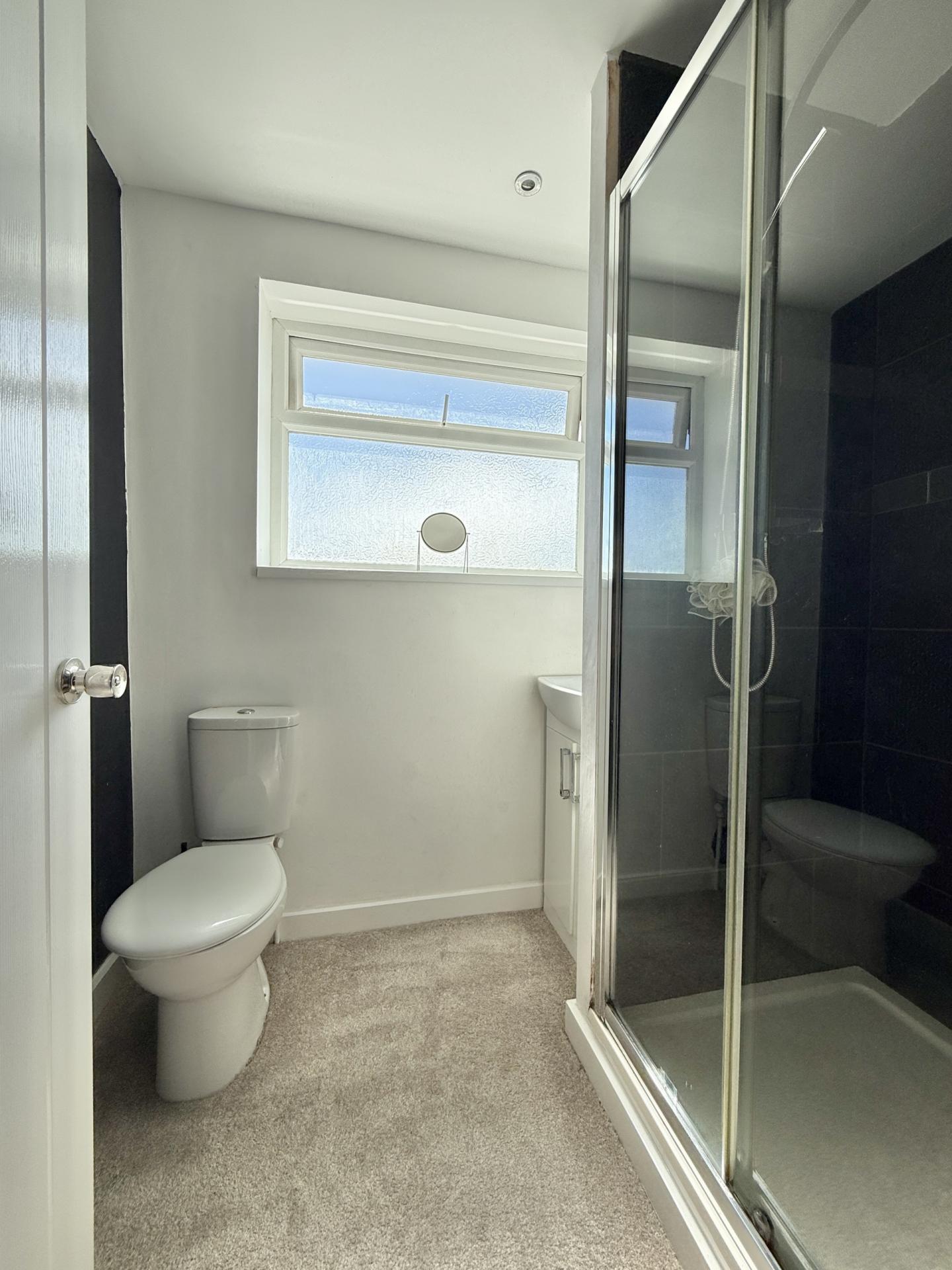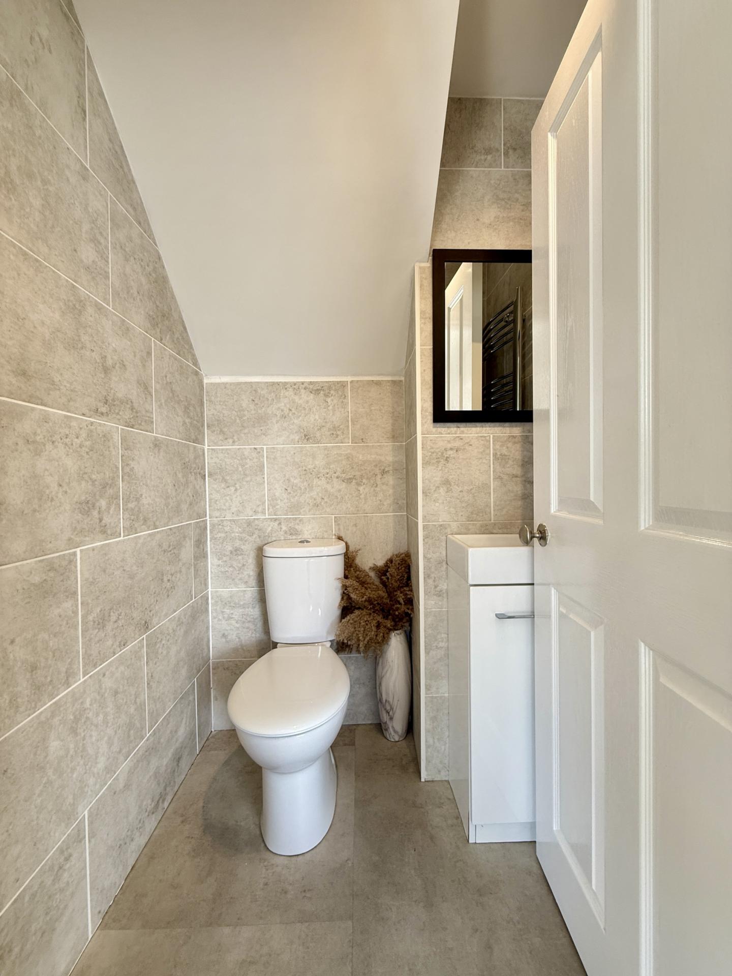 WC: Close coupled WC, wash hand basin, radiator, extractor fan.
