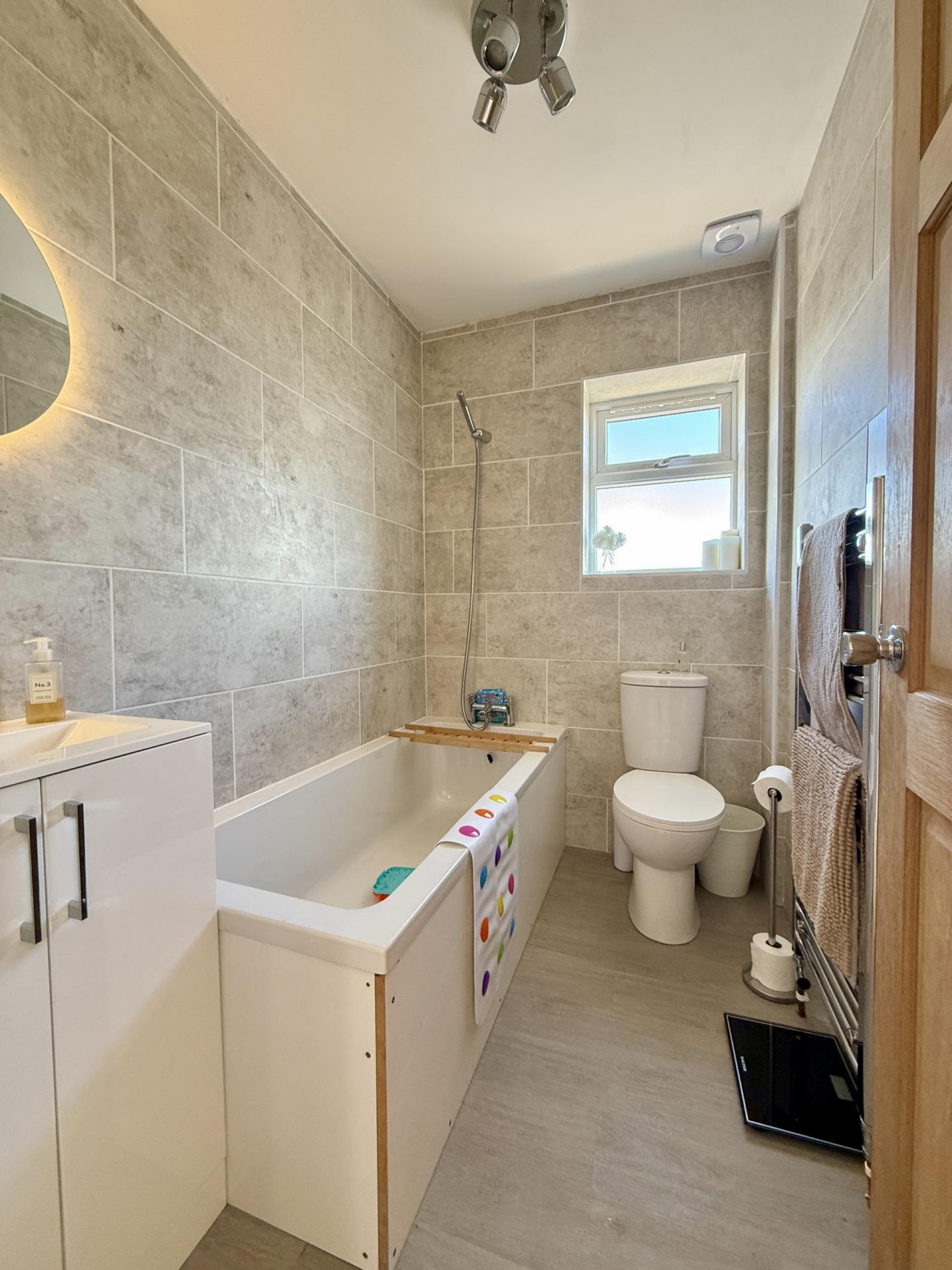 BATHROOM: Close coupled WC, wash hand basin, panelled bath, radiator, double glazed window to the side.