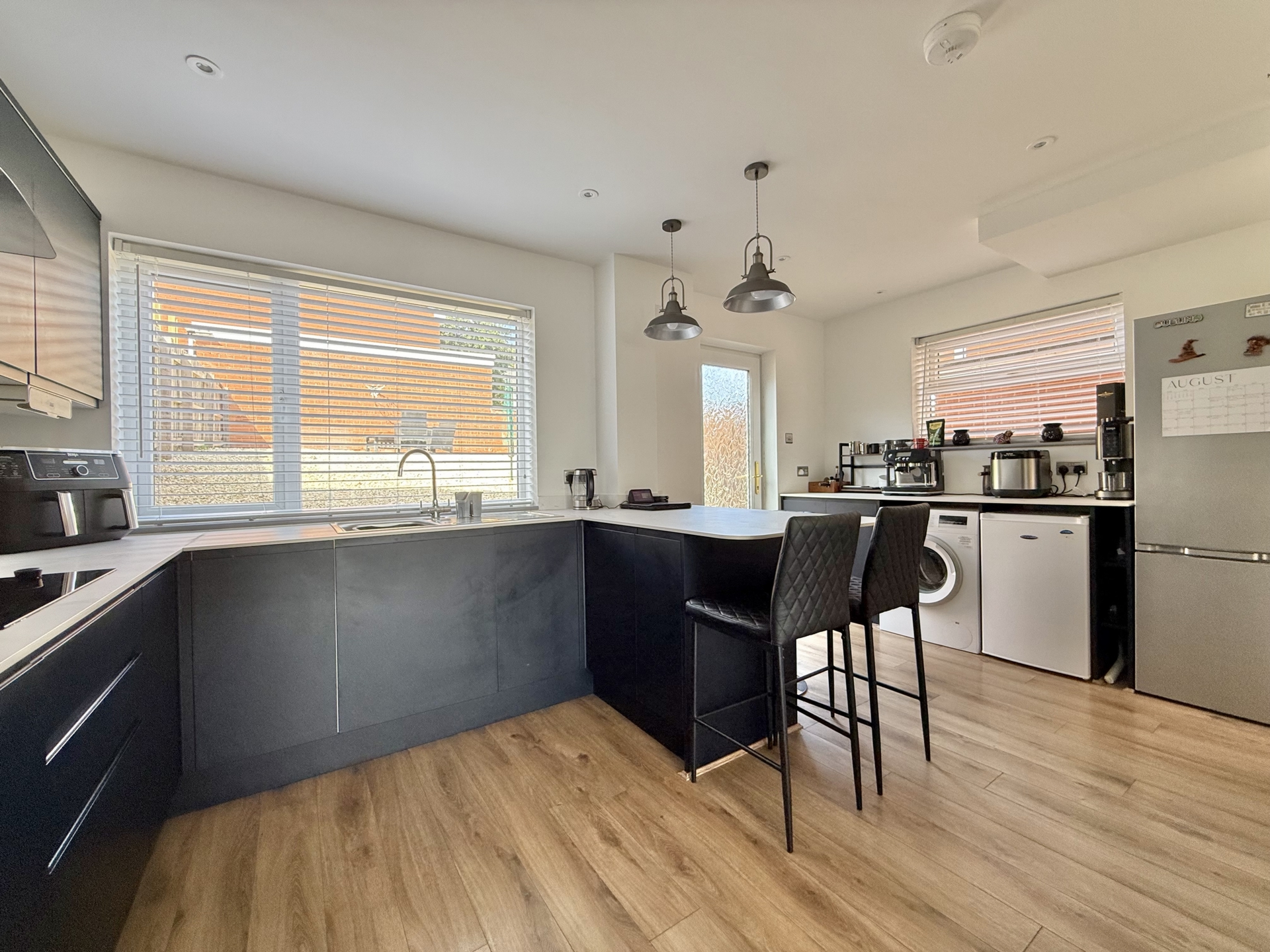 KITCHEN/DINER: 4.8m x 2.7m (15'9" x 8'10"), Base cupboards and drawers with worktop over, sink and drainer, built in oven, microwave and separate hob with hood over, space for fridge freezer, space for washing machine, double glazed window to the rear, double glazed door to the rear.