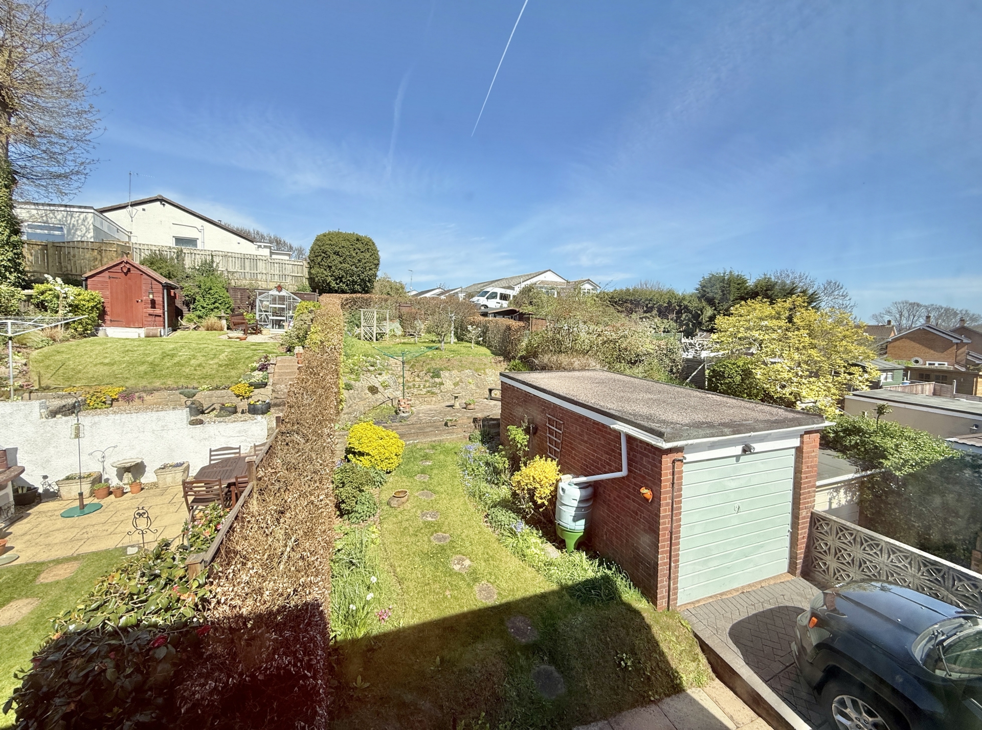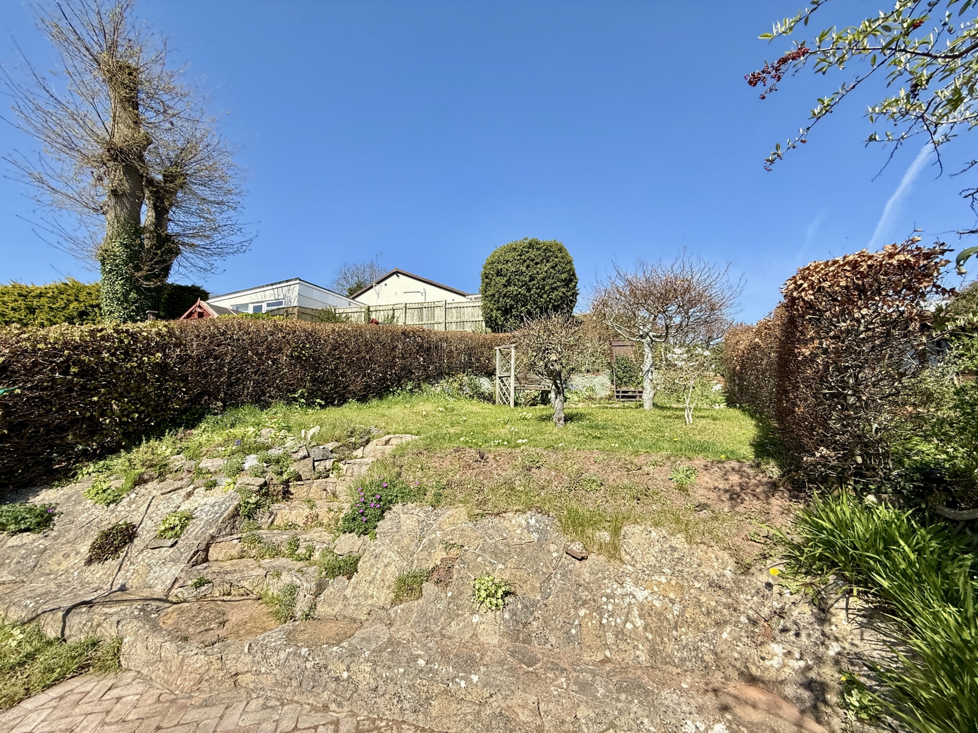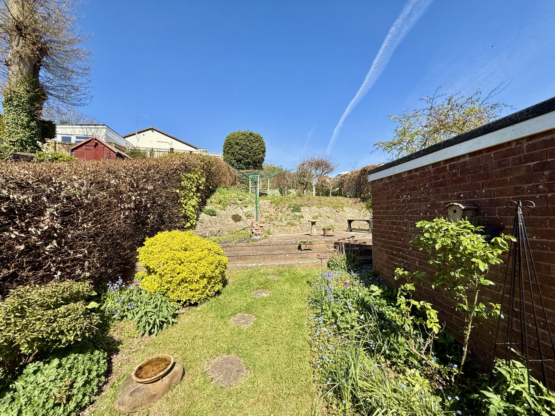 OUTSIDE: To the front of the property is a lawned garden bordered by hedgerow, with a driveway leading to the garage and providing off-road parking.The rear garden is a particular feature of the property, thoughtfully arranged across different levels. A paved patio leads to a lawned area, with steps rising to a further patio and additional steps leading to another section of lawn. The garden is well stocked with mature hedgerow, trees, and shrubs, creating an attractive and established outdoor space.