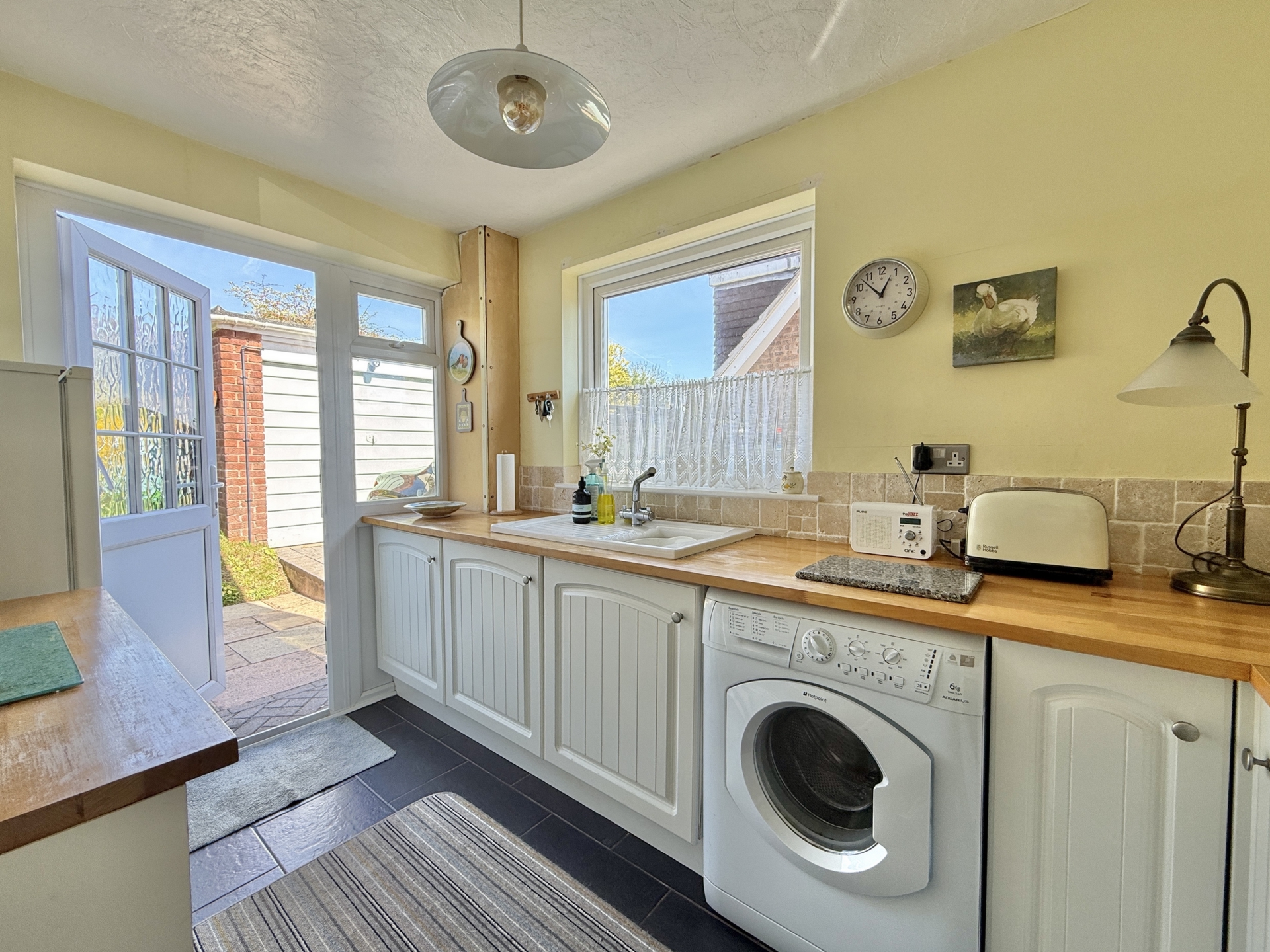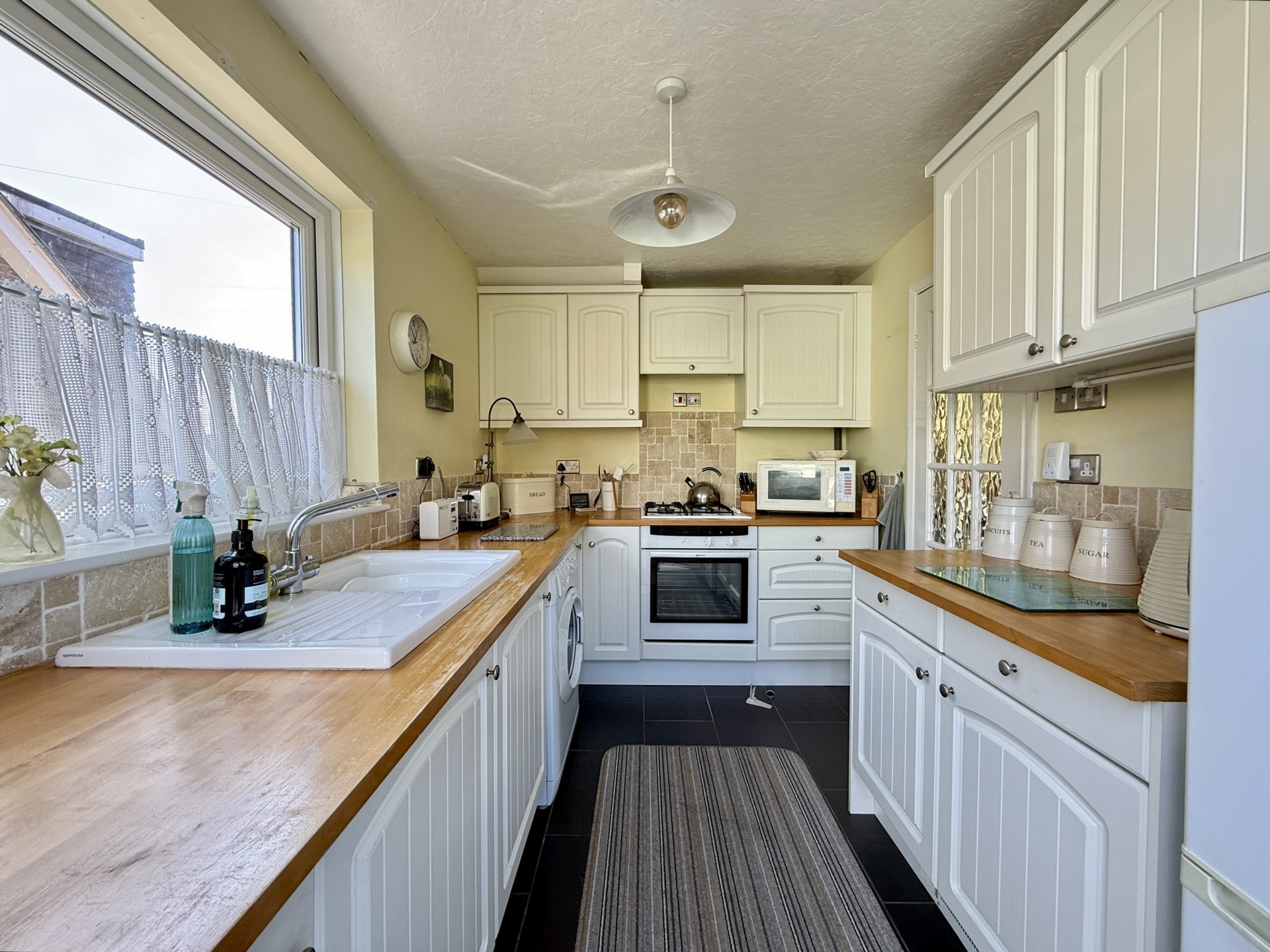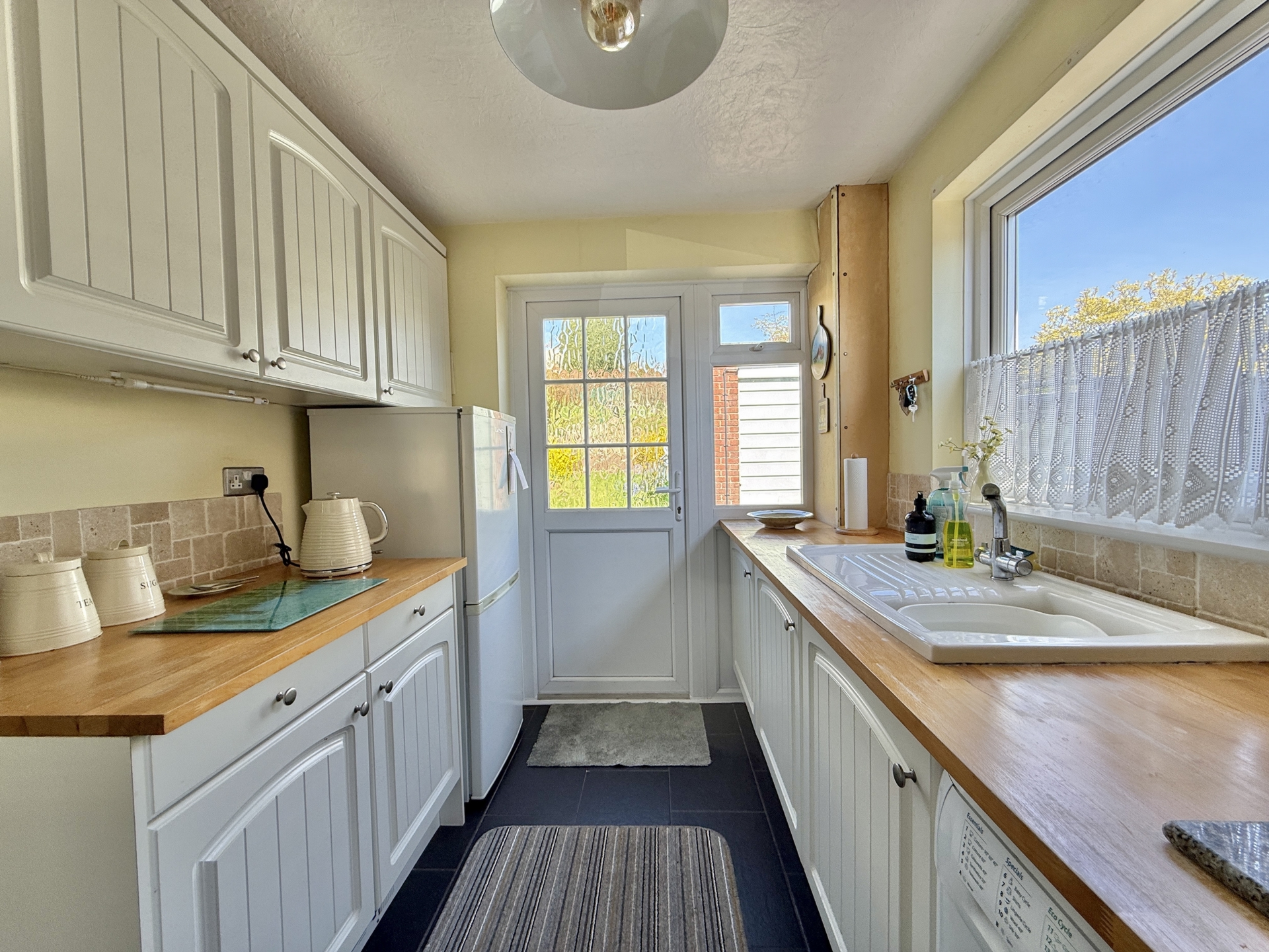 KITCHEN: 3.2m x 2.2m (10'6" x 7'3"), Base cupboards and drawers with worktop over, sink and drainer, built in oven and hob with extractor over, space for fridge freezer, space for washing machine, wall mounted cupboards, double glazed windows to the side and the rear, double glazed door to the rear.