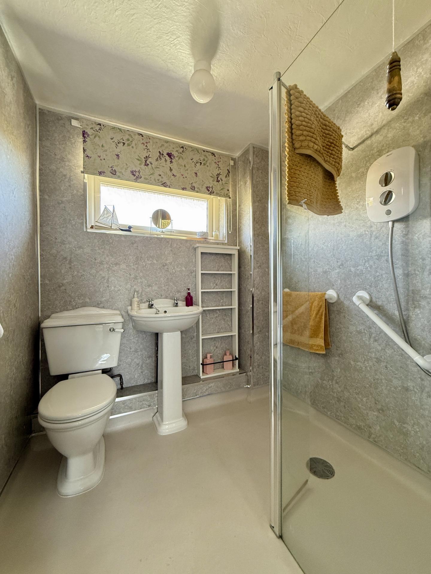 SHOWER ROOM/WET ROOM: Close coupled WC, pedestal wash hand basin, walk in shower, double glazed window to the rear.