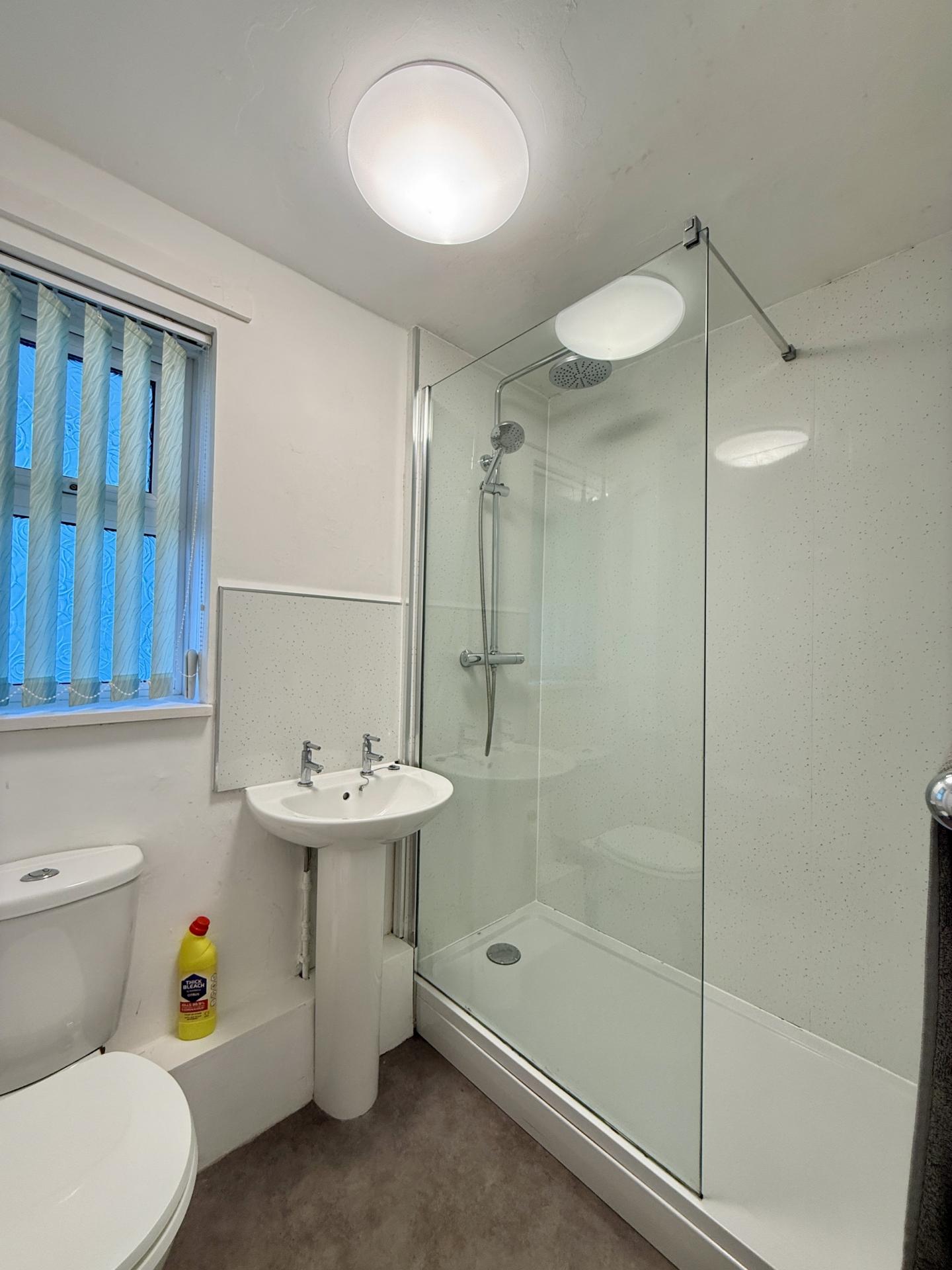 SHOWER ROOM: Close coupled WC, pedestal wash hand basin, walk in shower, double glazed window.