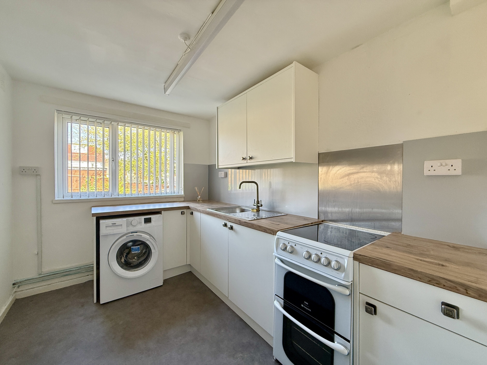 KITCHEN: 3.4m x 2.2m (11'2" x 7'3"), Base cupboards and drawer with woktop over, sink and drainer, space for cooker, space for washing machine, wall mounted cupboards, built in storage cupboard, radiator, double glazed window.