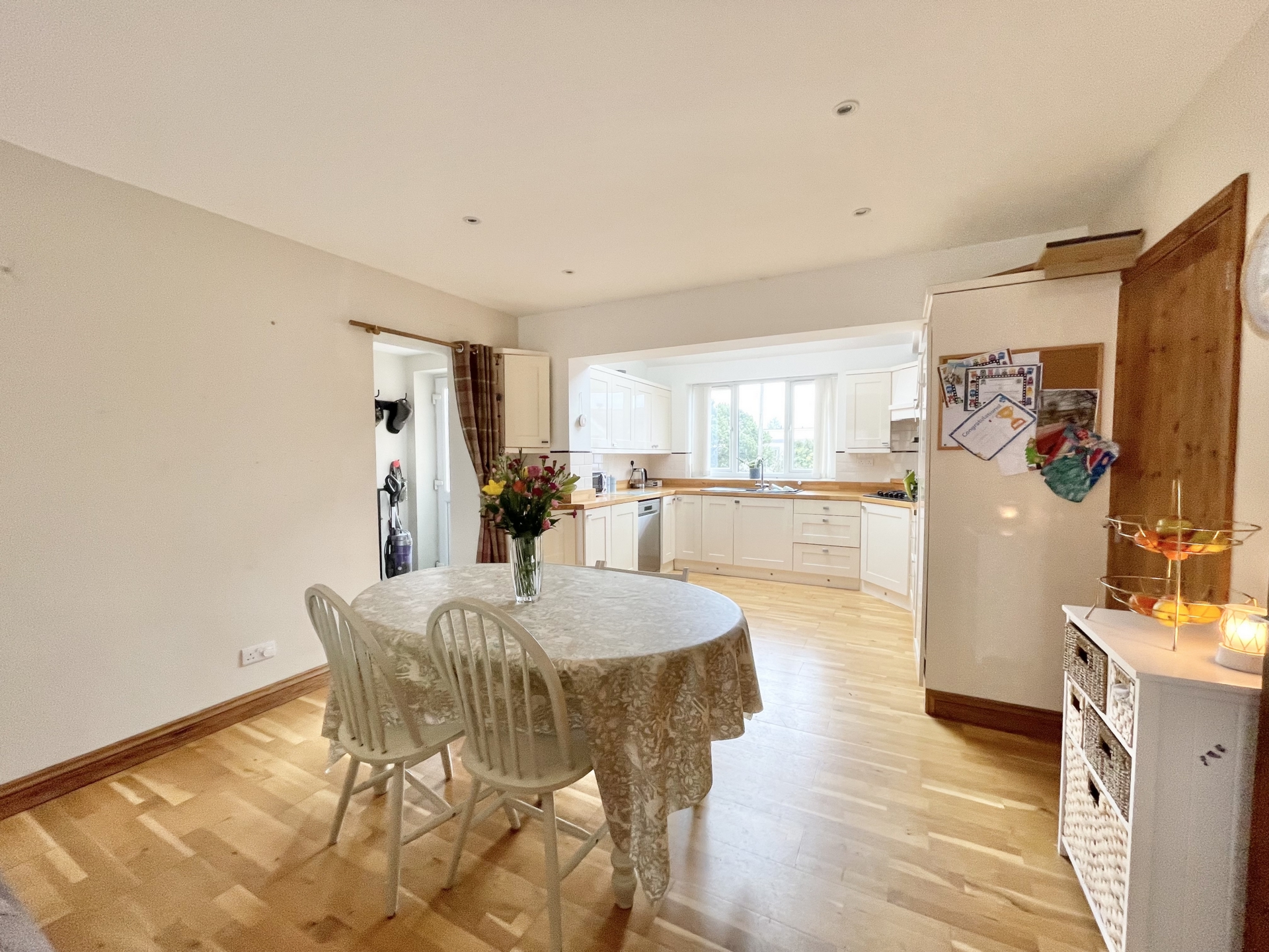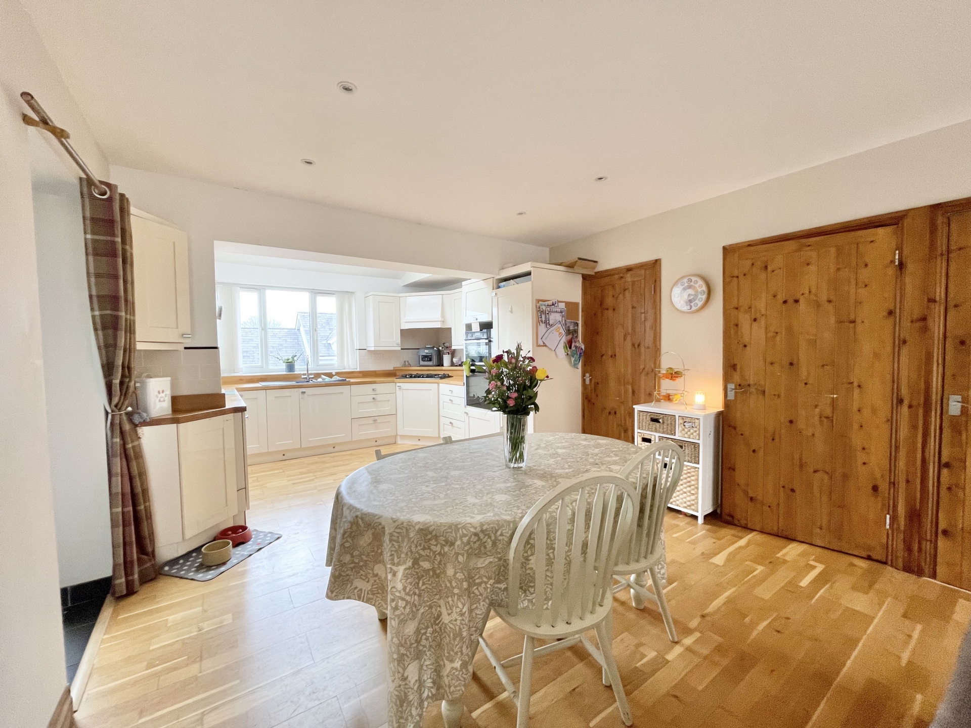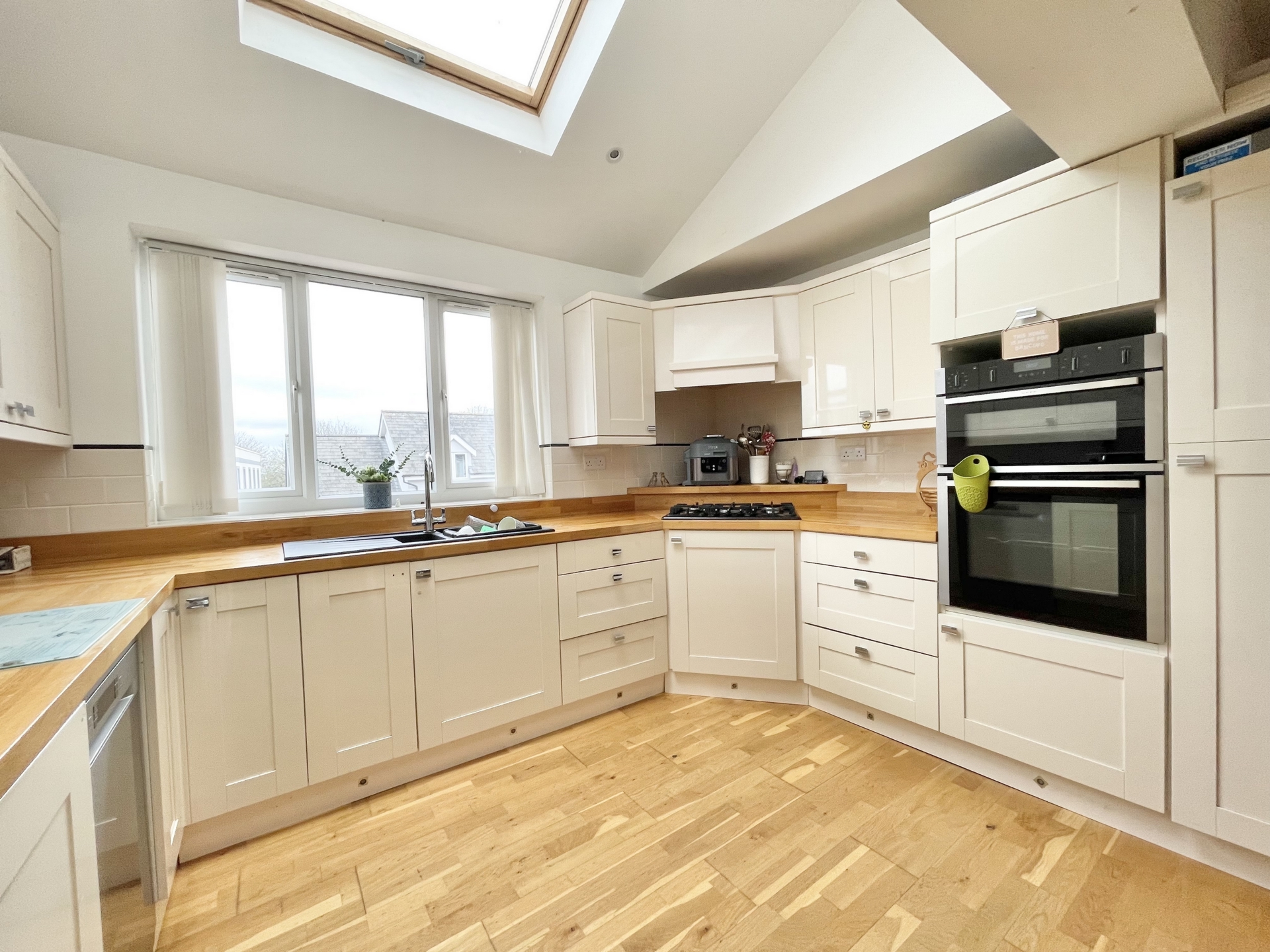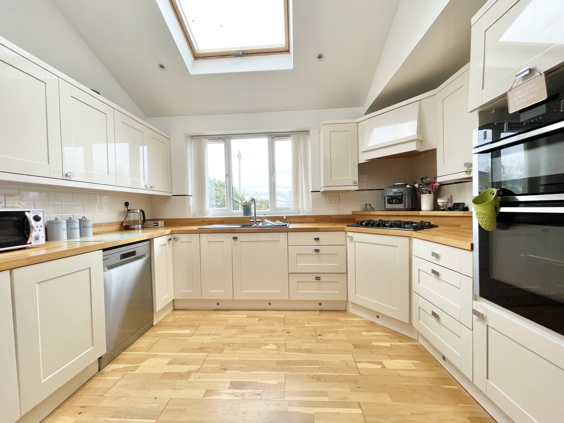 KITCHEN: 3.5m x 3.0m (11'6" x 9'10"), Base cupboards and drawers with worktop over, one and a half bowl sink and drainer, built in oven and 5 ring gs hob, built in fridge freezer, space for dishwasher, wall mounted cupboards, roof lights, double glazed window to the front.