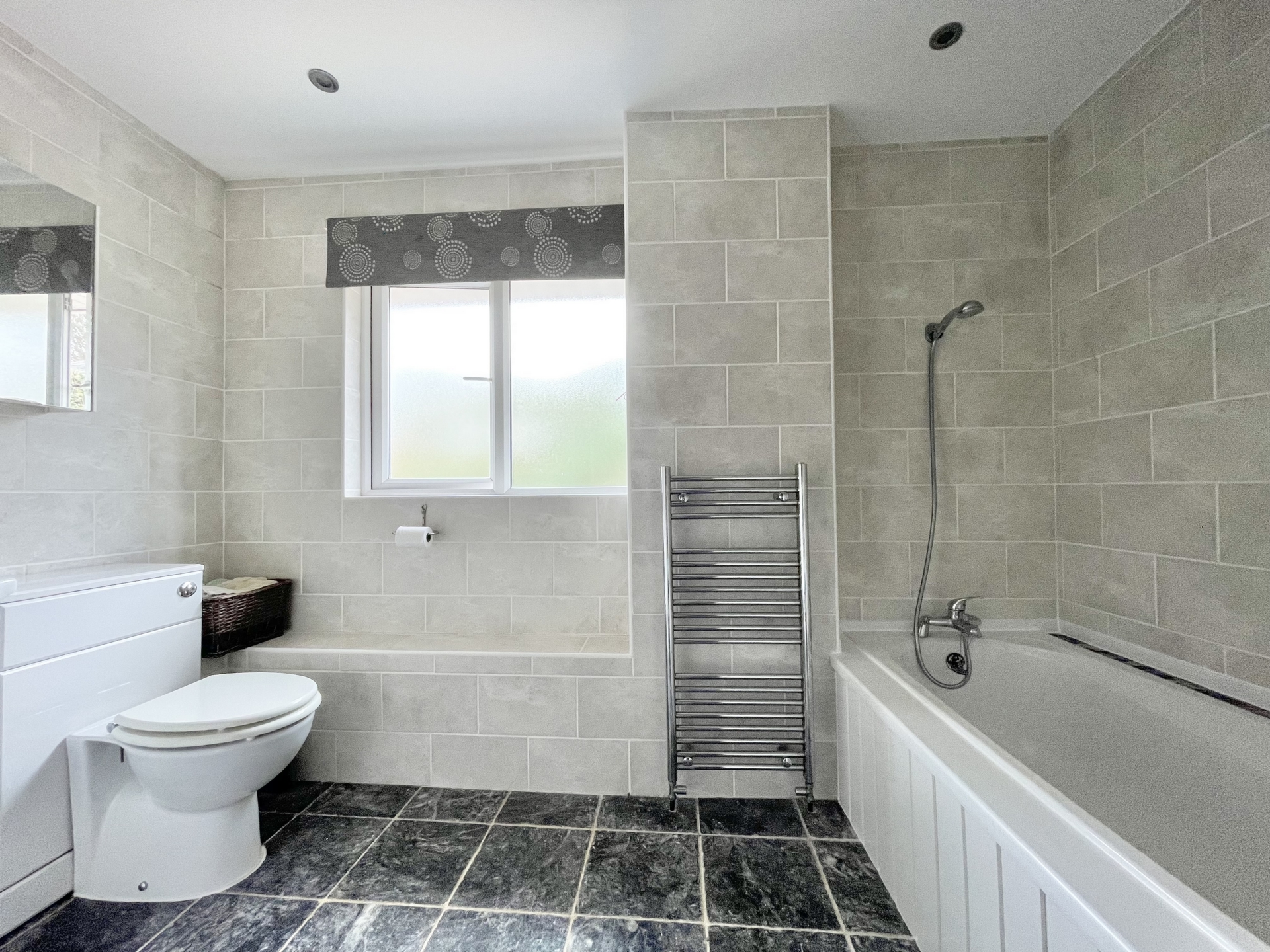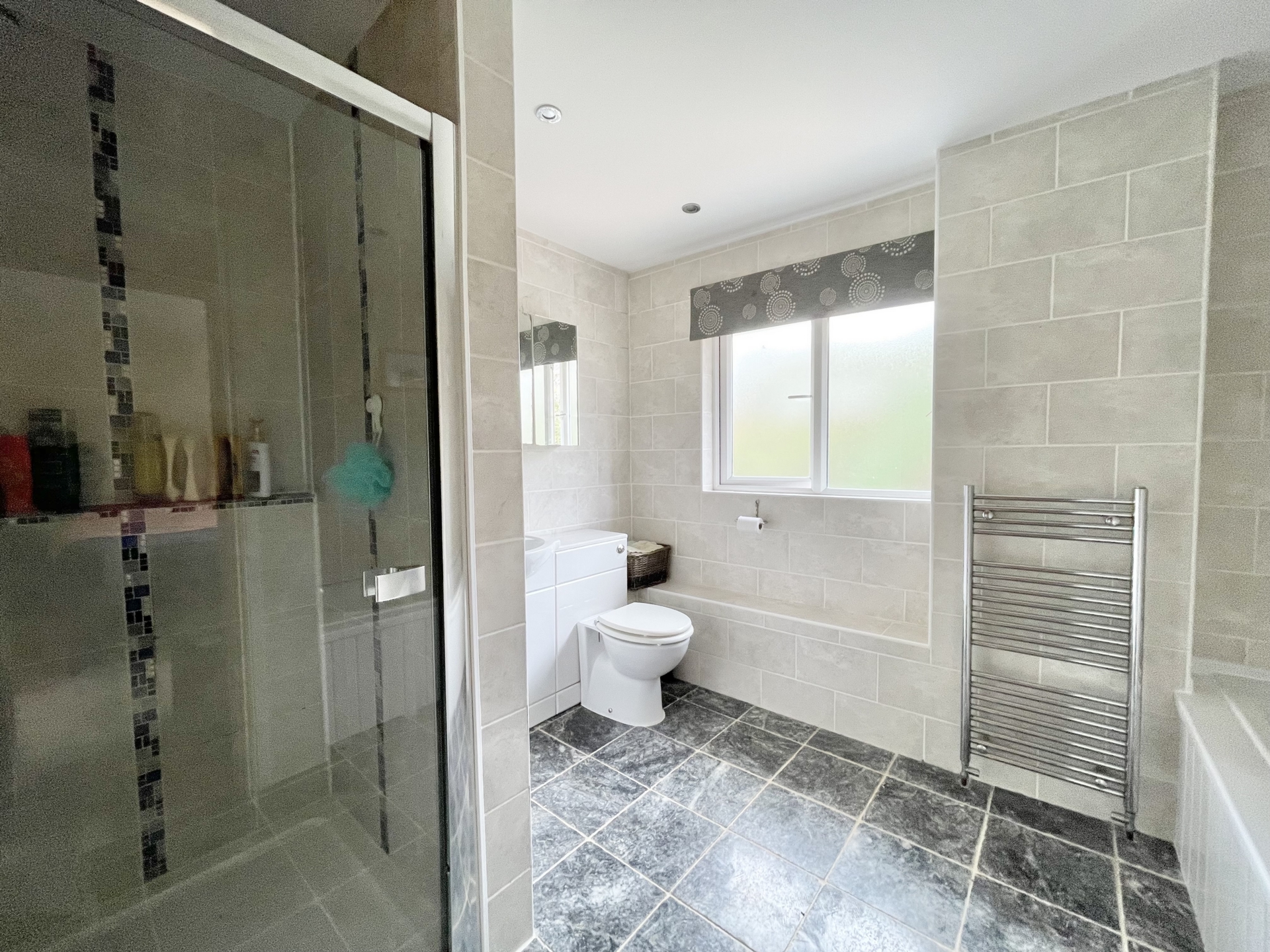 BATHROOM: Close coupled WC, wash hand basin with storage under, panelled bath, shower cubicle with shower over, heated towel rail, spot lights.