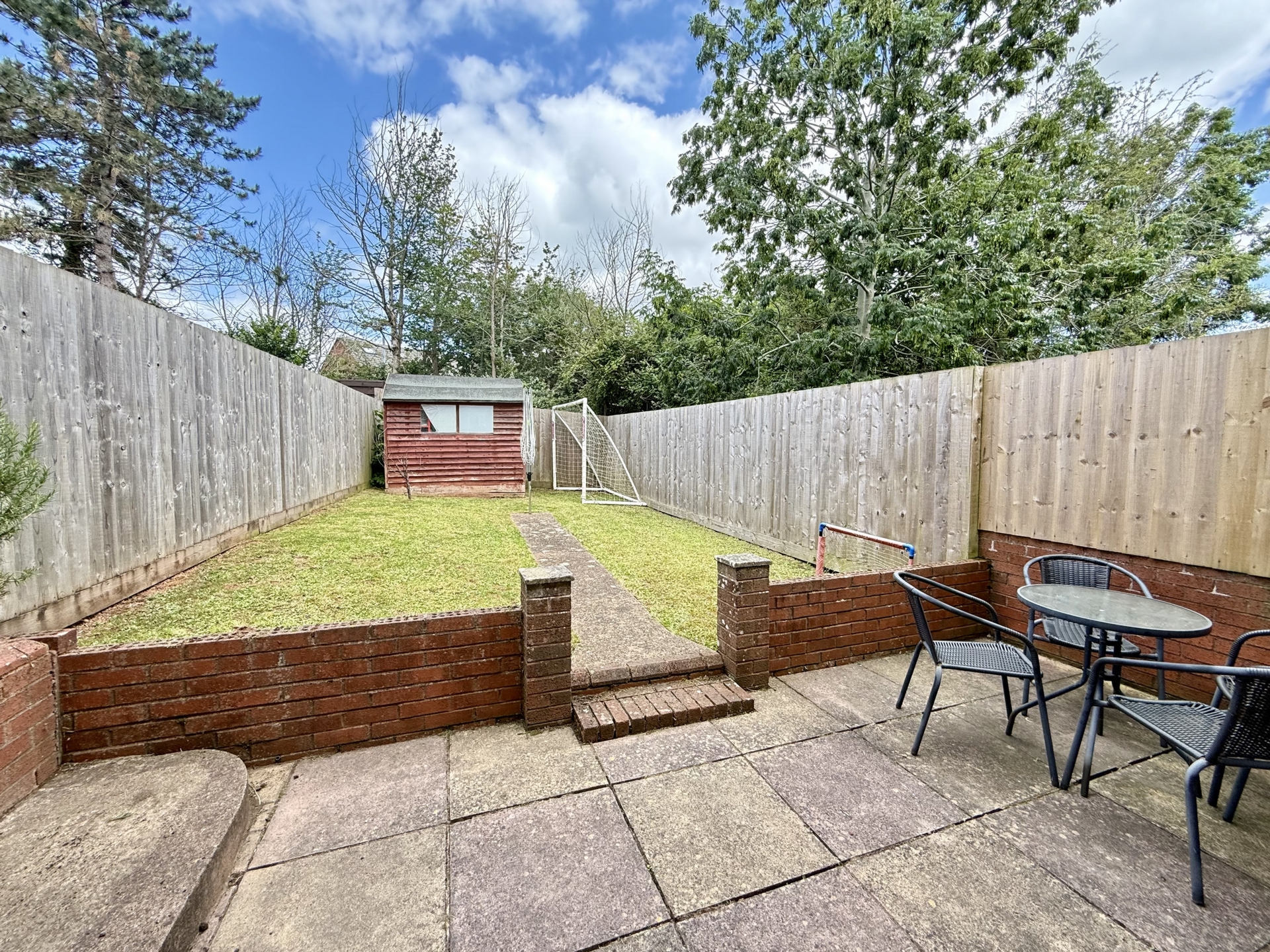 OUTSIDE: To the front of the property steps lead down to the front door. To the rear is an enclosed garden with paved patio area and section of grass lawn with handy timber storage shed.