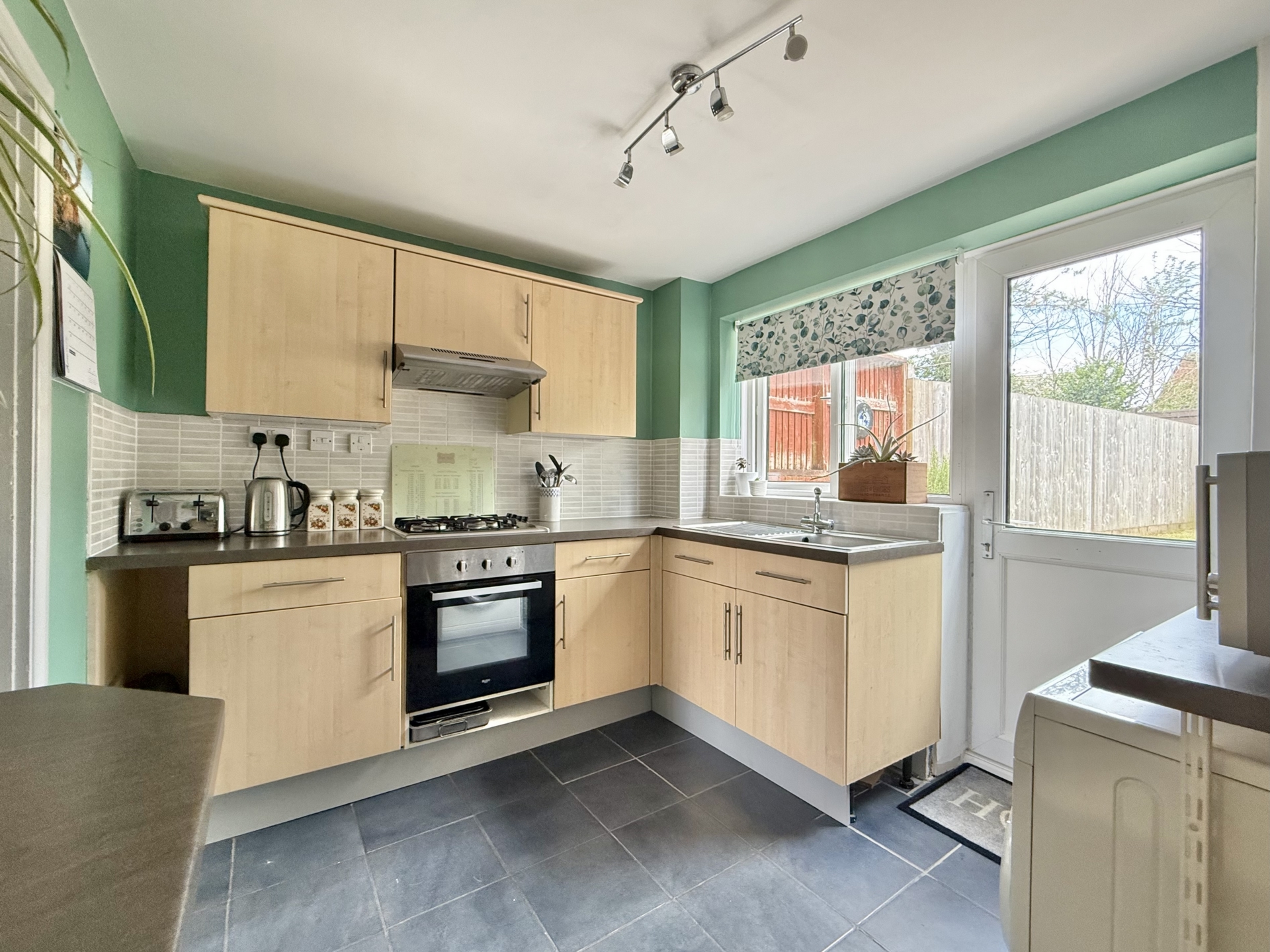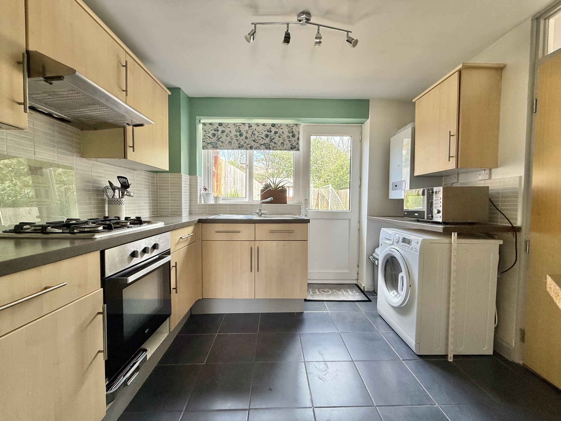 KITCHEN: 3.0m x 2.6m (9'10" x 8'6"), Base cupboards and drawers with worktop over, sink and drainer, built in oven and hob with extractor oer, space for washing machine, wall mounted boiler, wall mounted cupboards, double glazed window to the rear, double glazed door to the rear.