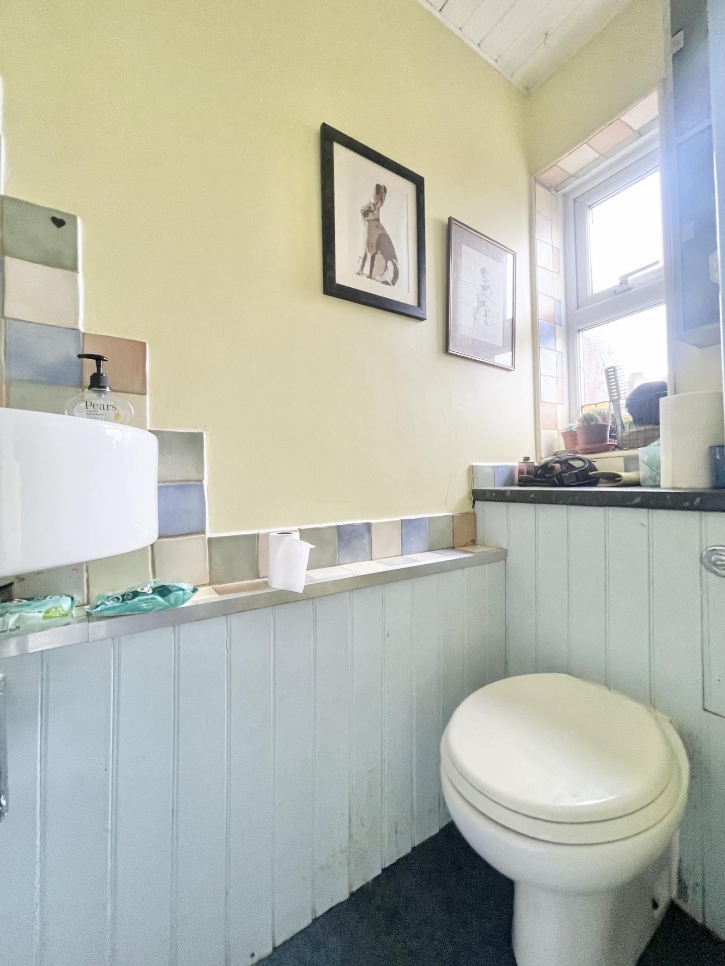 WC: Close coupled WC, wash hand basin, obscure double glazed window to the rear.