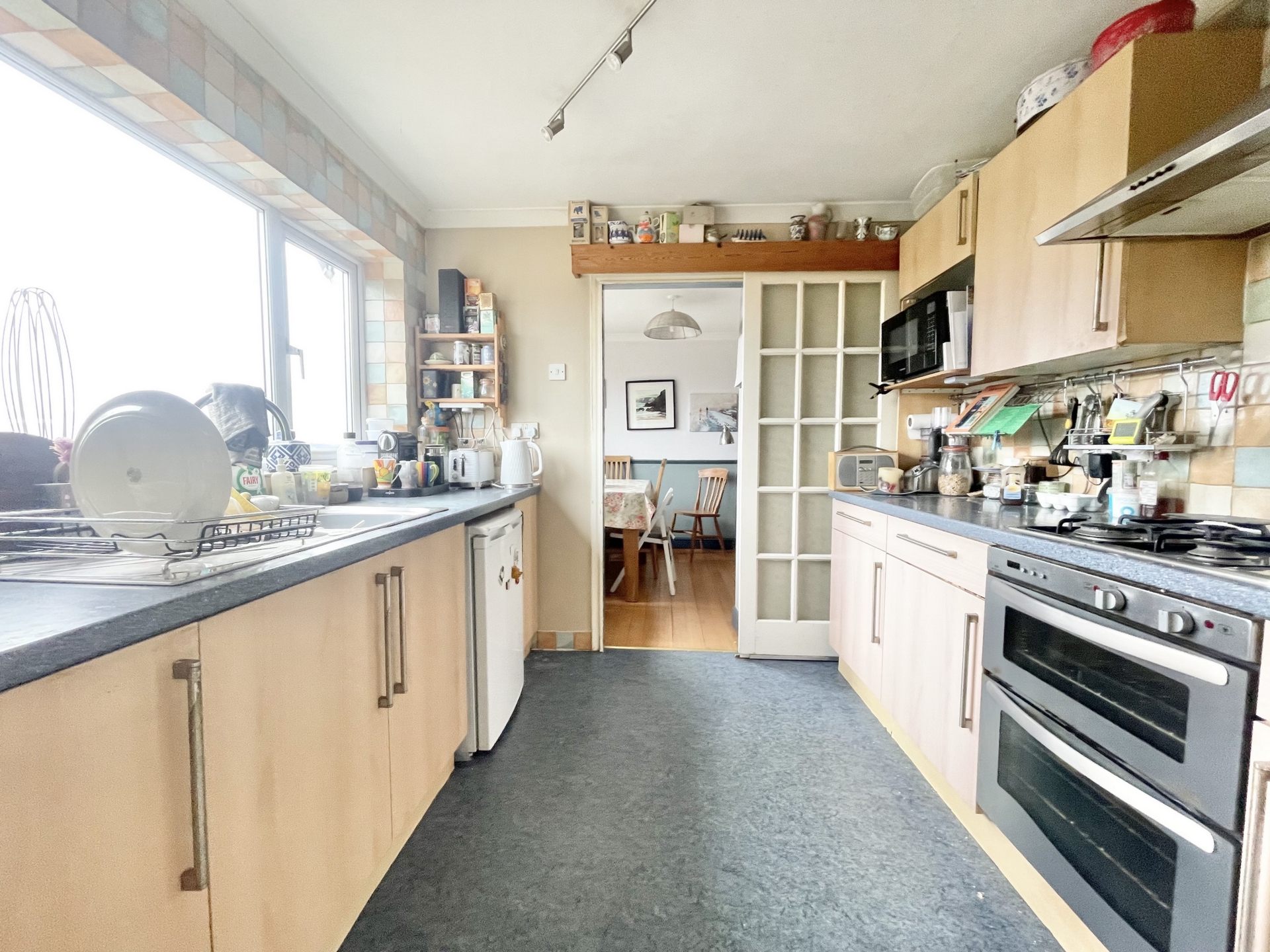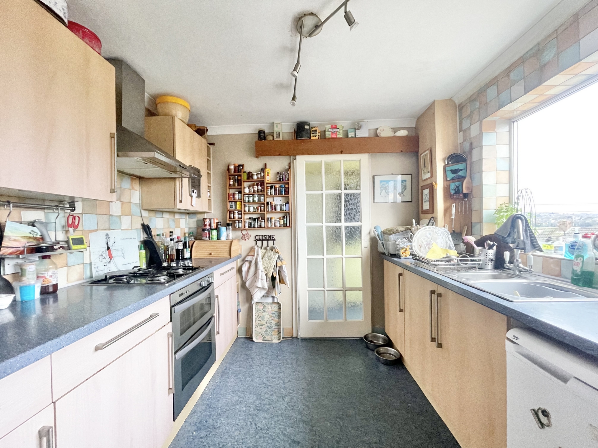 KITCHEN: 2.8m x 2.8m (9'2" x 9'2"), Base cupboards and drawers with worktop over, sink and drainer with mixer tap, built in oven and hob, space for fridge, double glazed window to the rear with views, door to..
