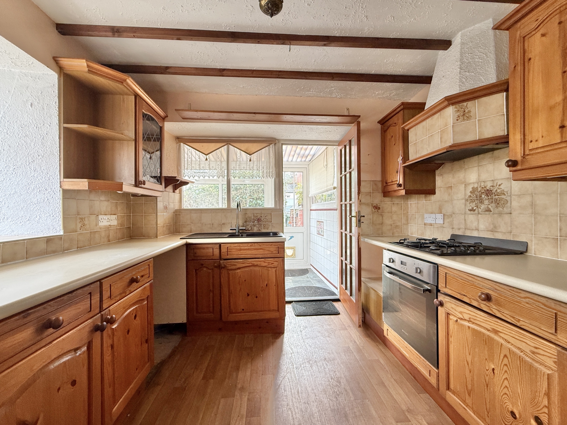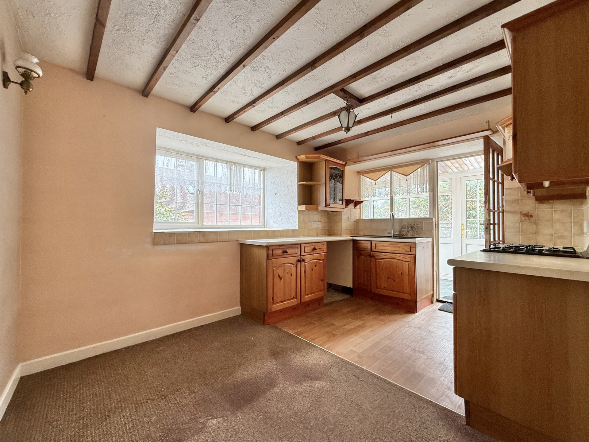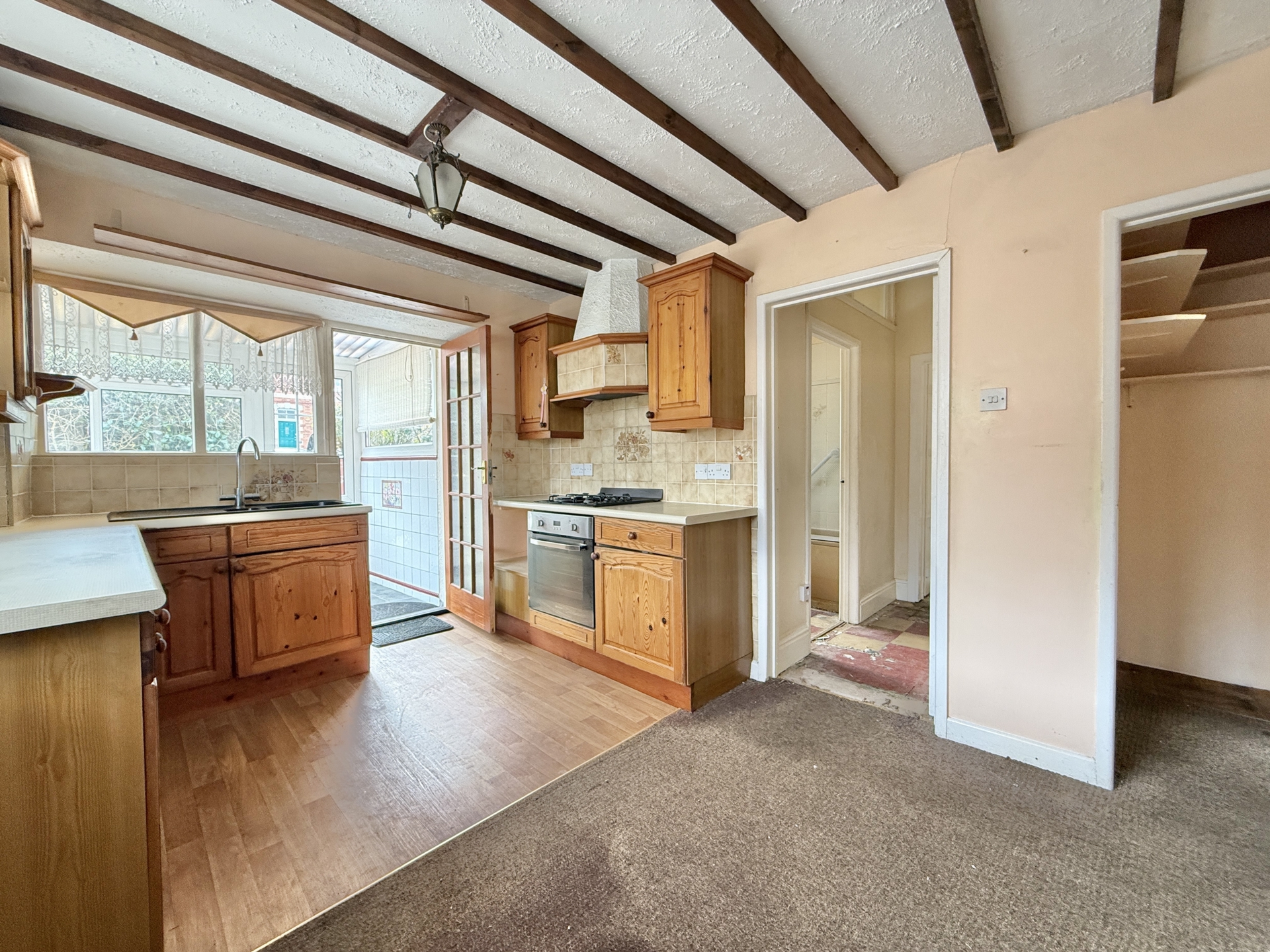 KITCHEN: 4.1m x 2.9m (13'5" x 9'6"), Base cupboards and drawers with worktop over, sink and drainer, built in oven and hob, wall mounted cupboards, walk in storage cupboard, double glazed window to the side.