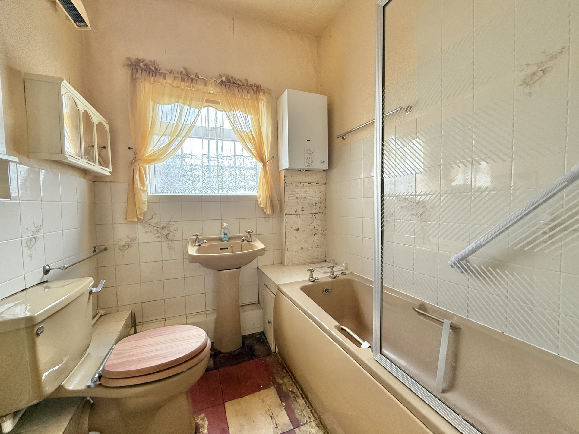 BATHROOM: Close coupled WC, pedestal wash hand basin, panelled bath, wall mounted boiler, double glazed window to the front.